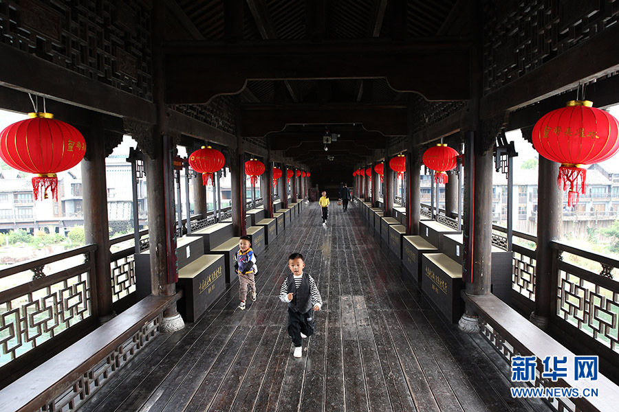 三两小孩在濯水古镇风雨廊桥上嬉戏。新华网发(杨敏摄)
