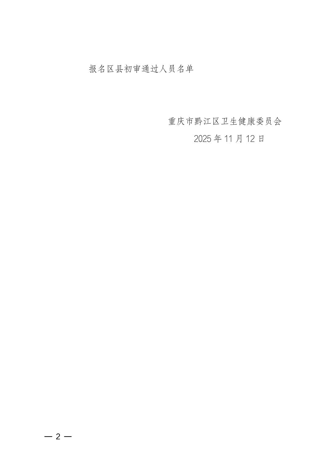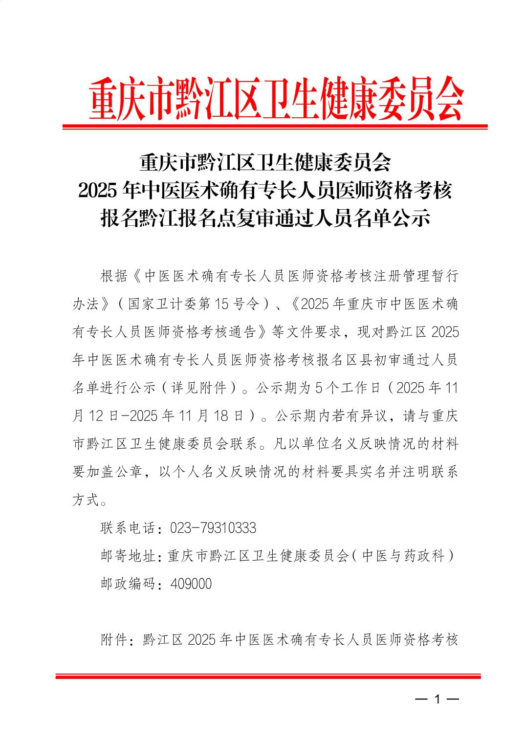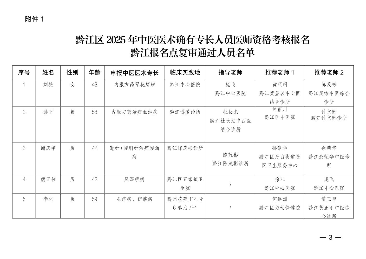 重庆市黔江区卫生健康委员会2025年中医医术确有专长人员医师资格考核报名黔江报名点复审通过人员名单公示