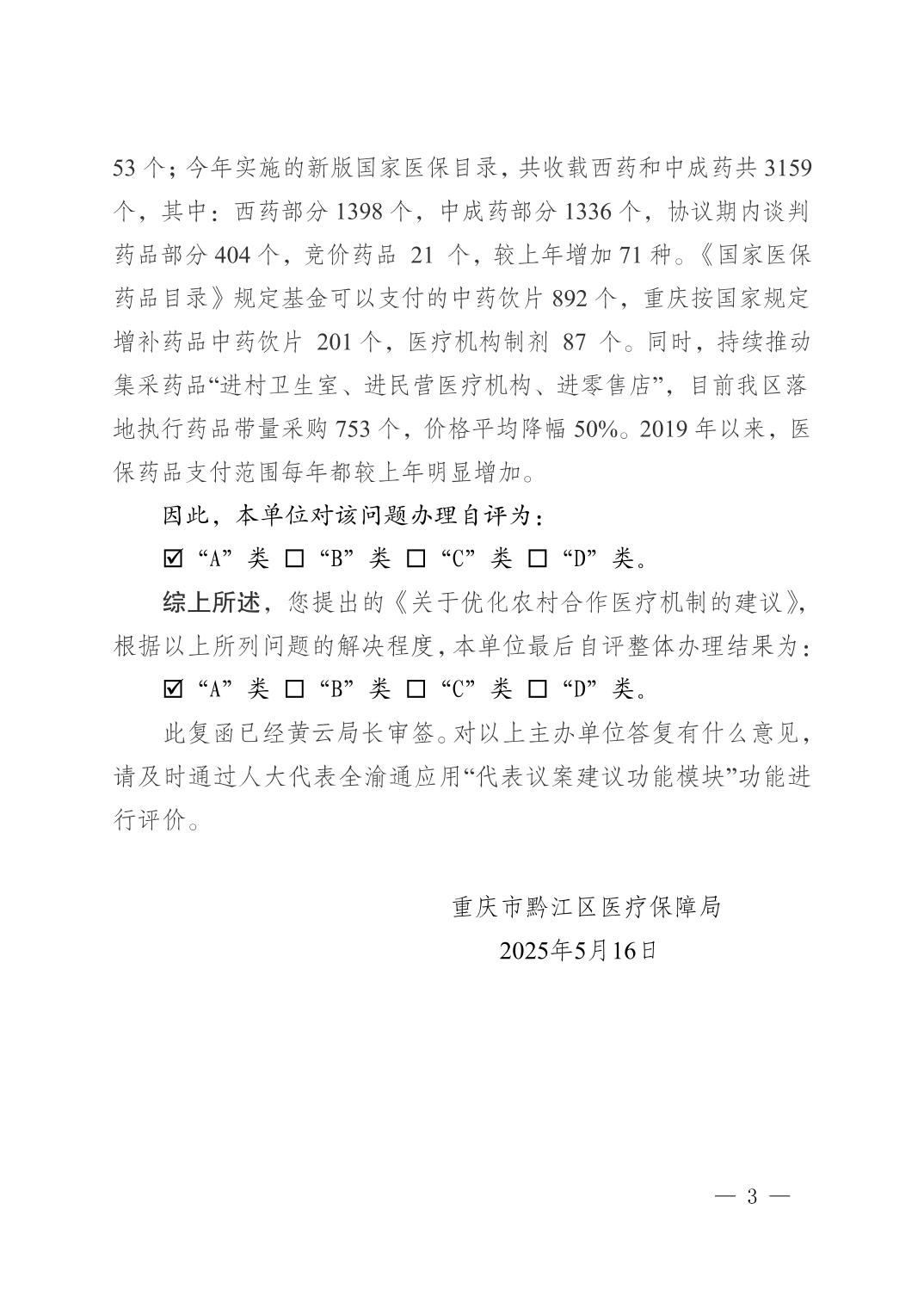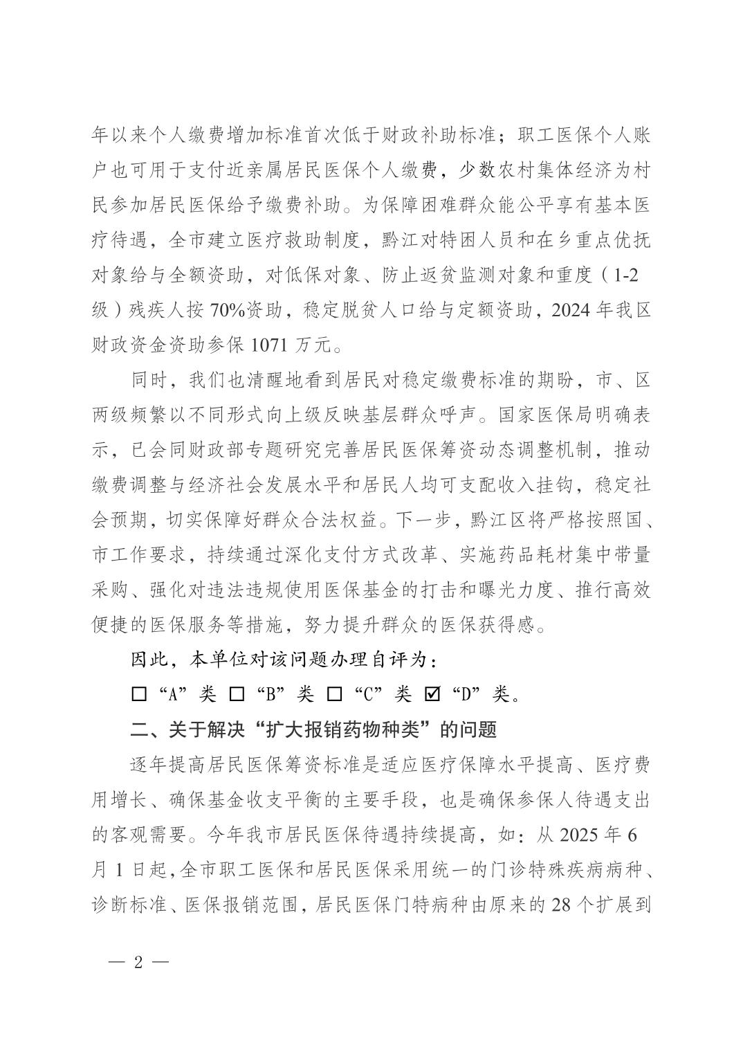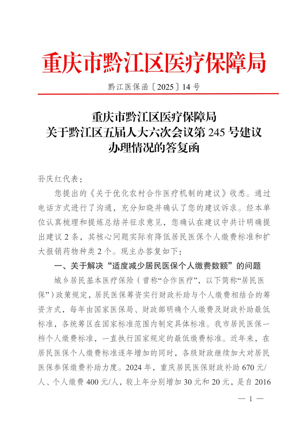 重庆市黔江区医疗保障局关于黔江区五届人大六次会议第245号建议办理情况的答复函