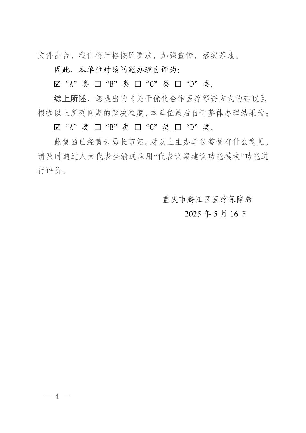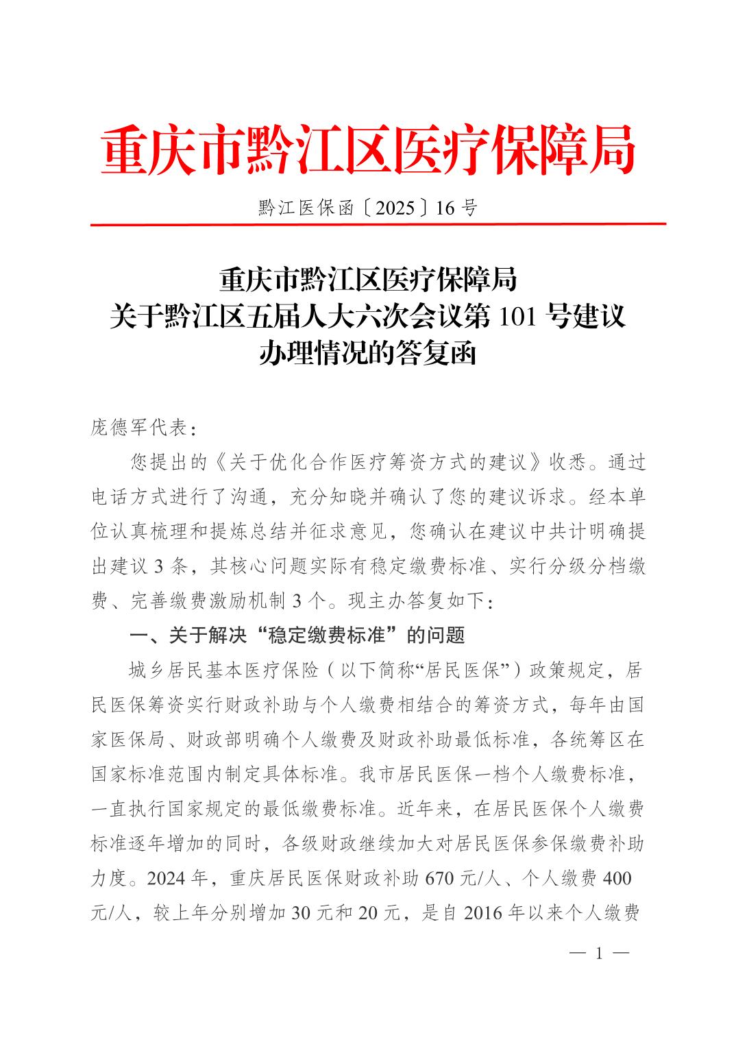 重庆市黔江区医疗保障局关于黔江区五届人大六次会议第101号建议办理情况的答复函