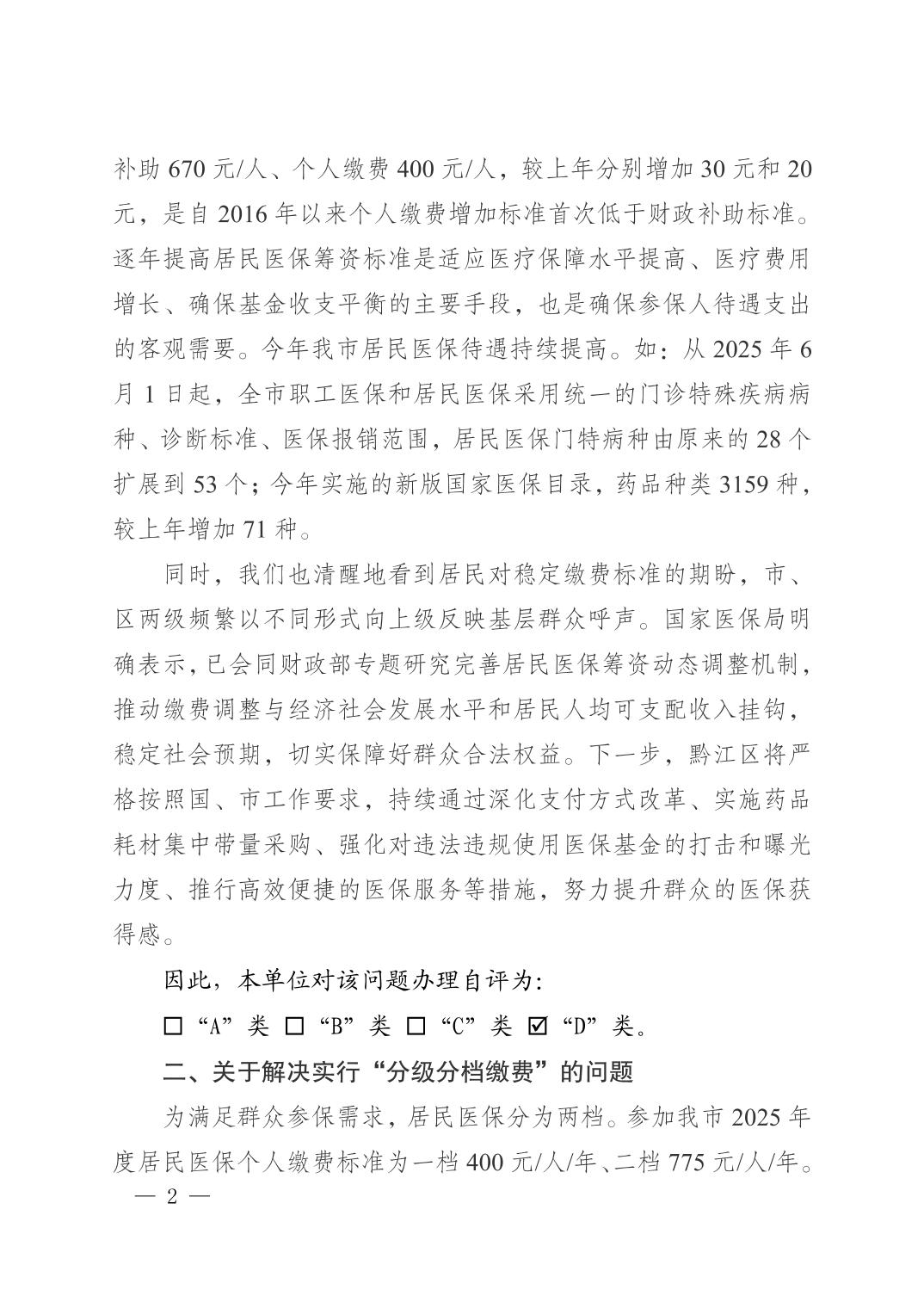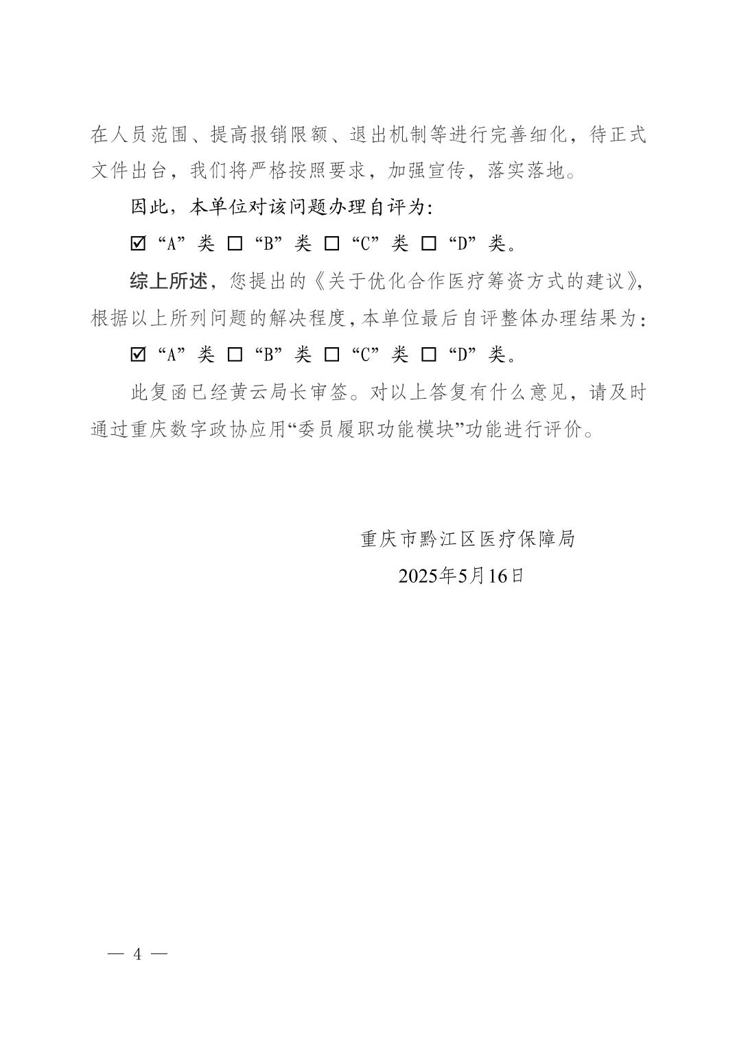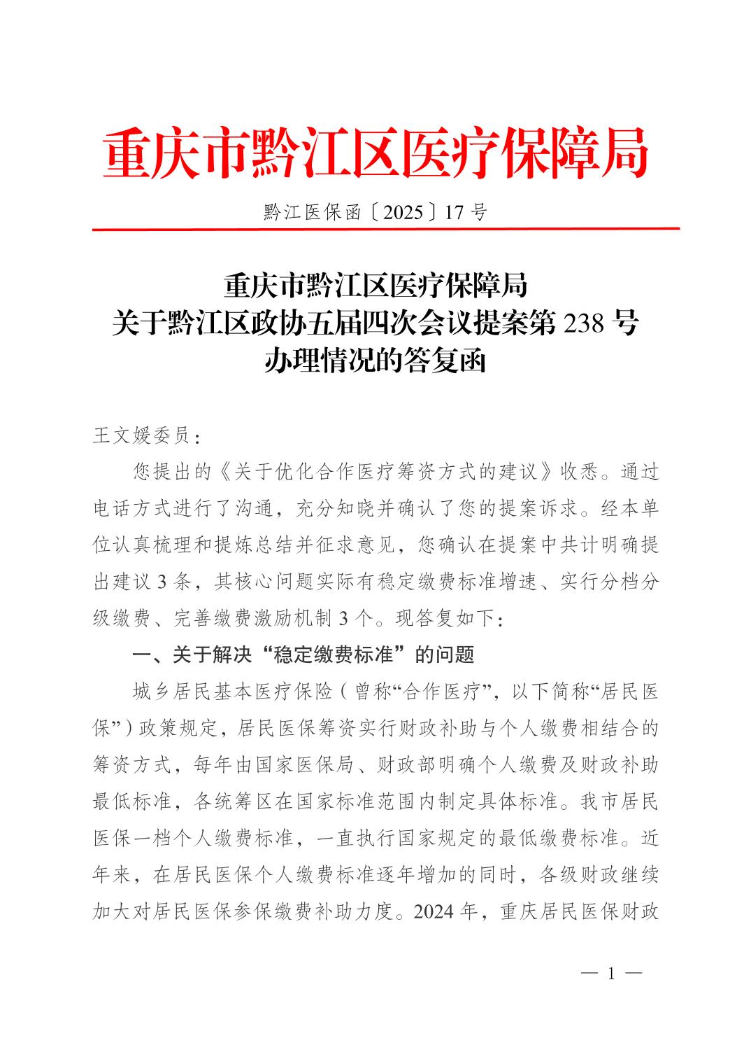 重庆市黔江区医疗保障局关于黔江区政协五届四次会议提案第238号办理情况的答复函