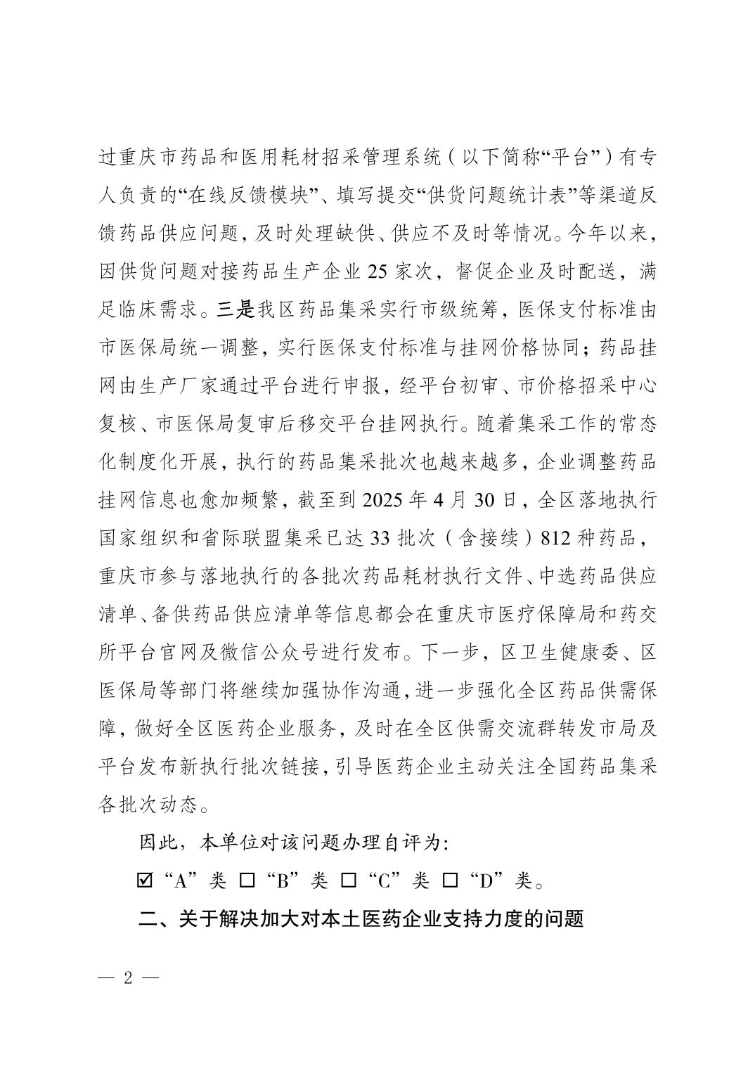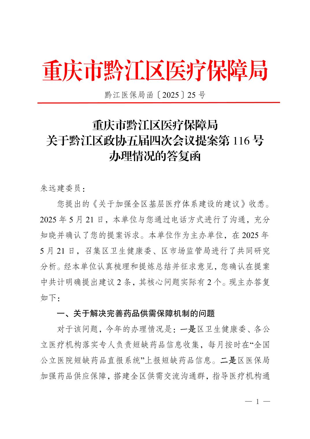 重庆市黔江区医疗保障局关于黔江区政协五届四次会议提案第116号办理情况的答复函