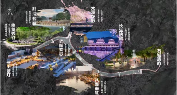 “4A景区”核心区打造:围绕区委、区政府将老城打造为“4A”景区的部署,项目在武陵水岸等核心区域进行重点景观塑造,提炼“黔河新八景”,分别为武陵欢歌、长生映黛、木溪花影、八面垂虹、册山繁灯、黔河载歌、石城遗韵、幽篁秀谷。