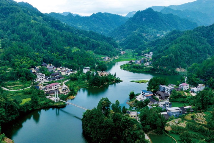 7月21日,黔江区太极水库库区的白土乡安堡村民居与绿水青山、田园、公路相映,美景如画。黔江区坚持生态优先、绿色发展理念,建立区、乡镇(街道)、村(社区)三级河库长体系,实现全区河库长全覆盖,对辖区所有河道、水库的环境卫生、植被保护、水资源保护等进行巡查,打造最美河道、最美水库。通过保护,全区河(库)水质均达到管护目标,城乡饮用水水源地水质达标率100%,出现了山清水秀河畅岸绿库净的美景。