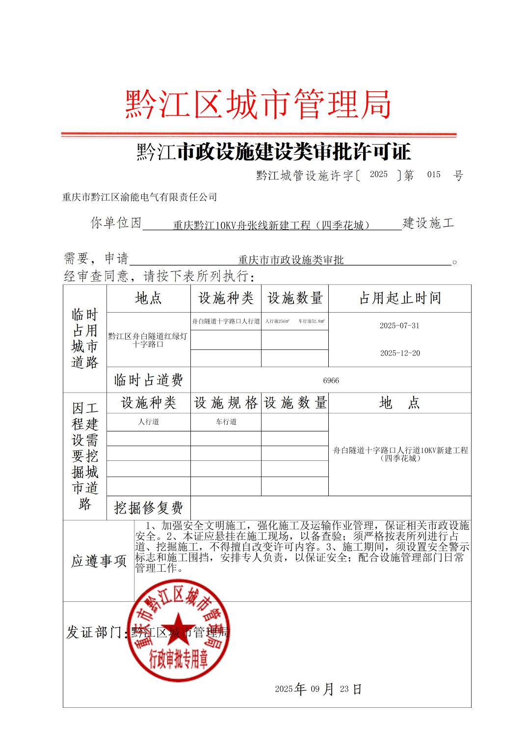 市政行政审批许可证(市政设施(2025)第015号)