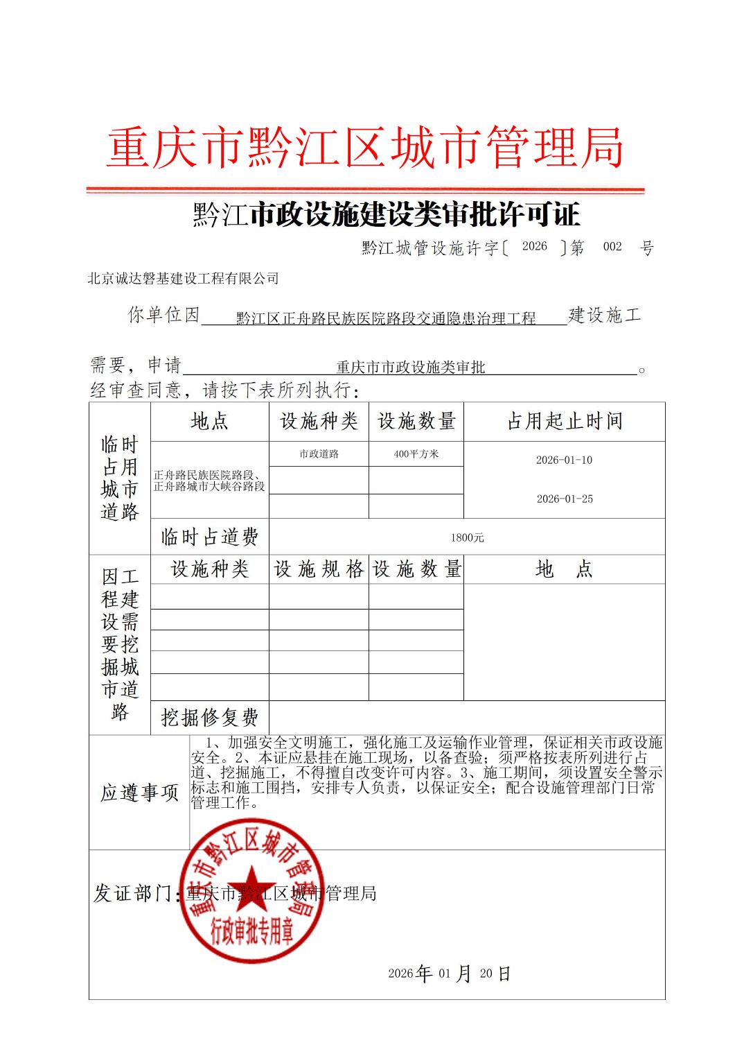 市政行政审批许可证(市政设施(2026)第02号)