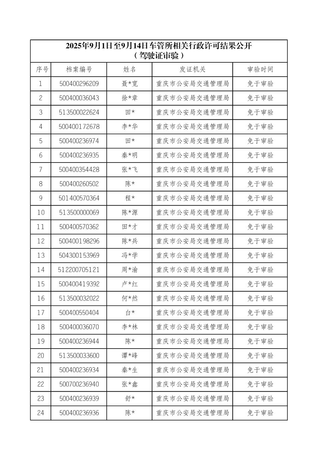 2025年9月1日至9月14日车管所相关行政许可结果公开(驾驶证审验)