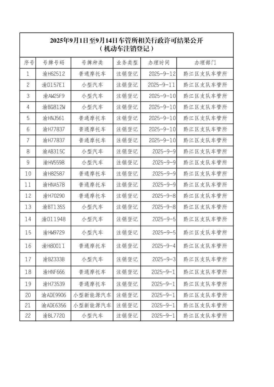 2025年9月1日至9月14日日车管所相关行政许可结果公开(机动车注销登记)