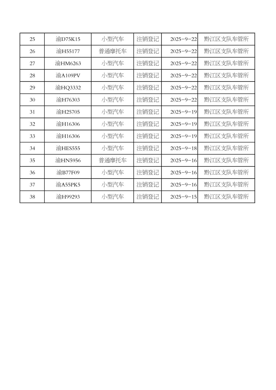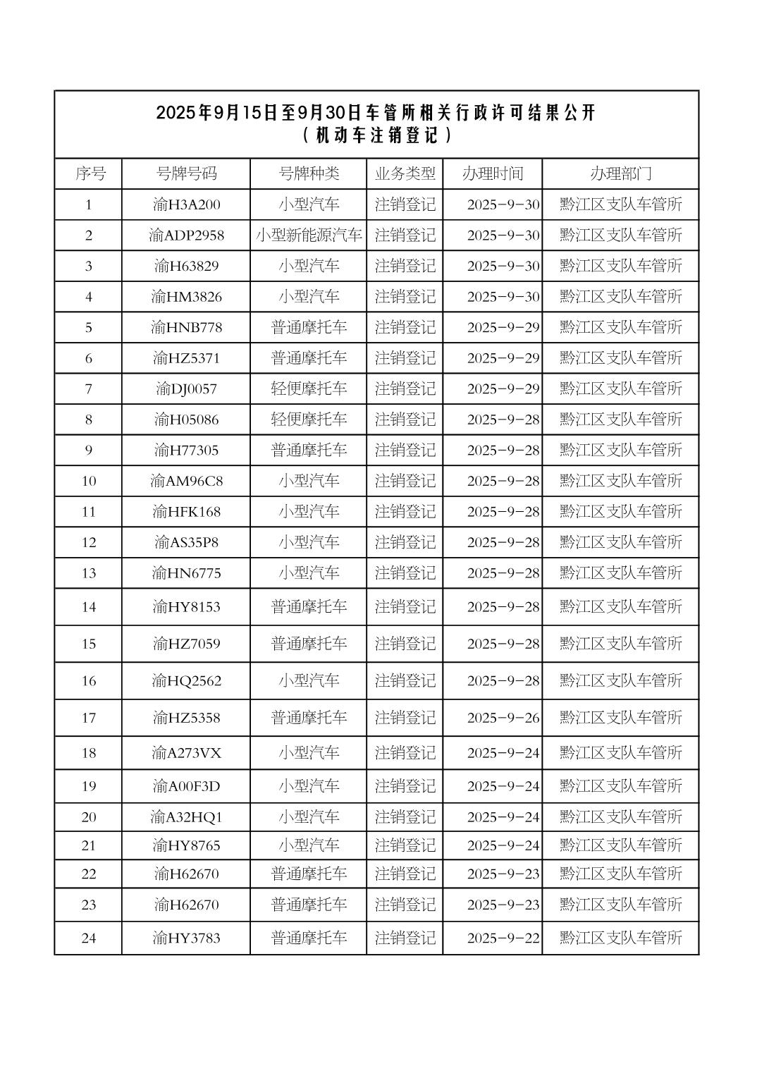 2025年9月15日至2025年9月30日黔江区公安局车管所相关行政许可结果公开(机动车注销登记)