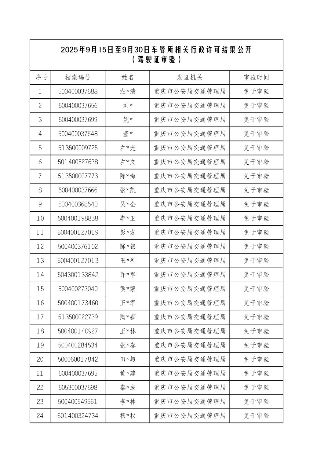 2025年9月15日至9月30日车管所相关行政许可结果公开(驾驶证审验)