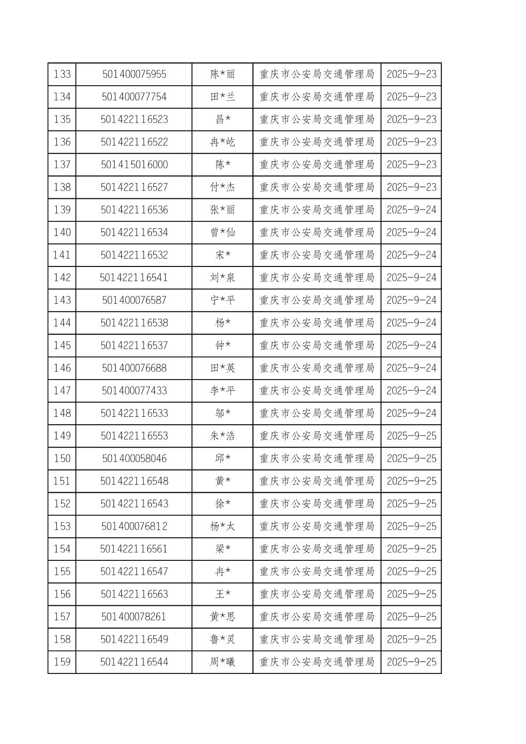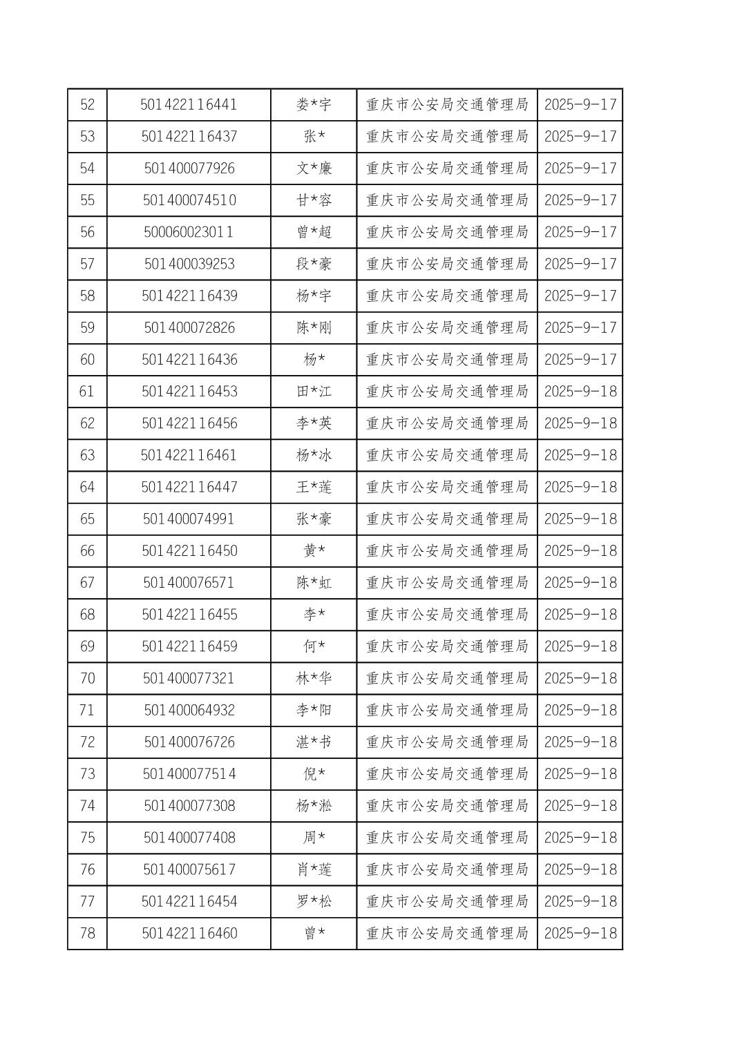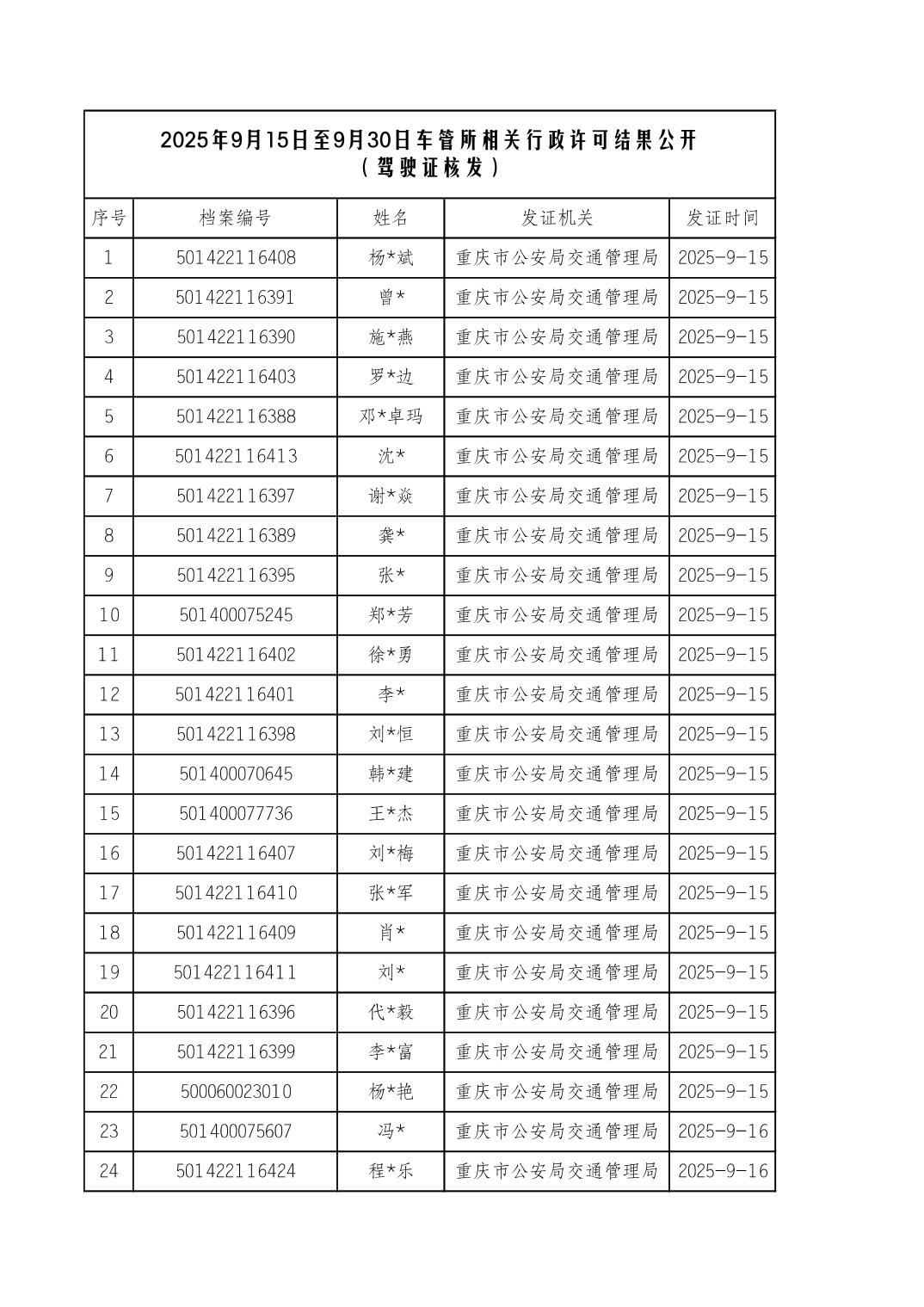 2025年9月15日至9月30日车管所相关行政许可结果公开(驾驶证核发)