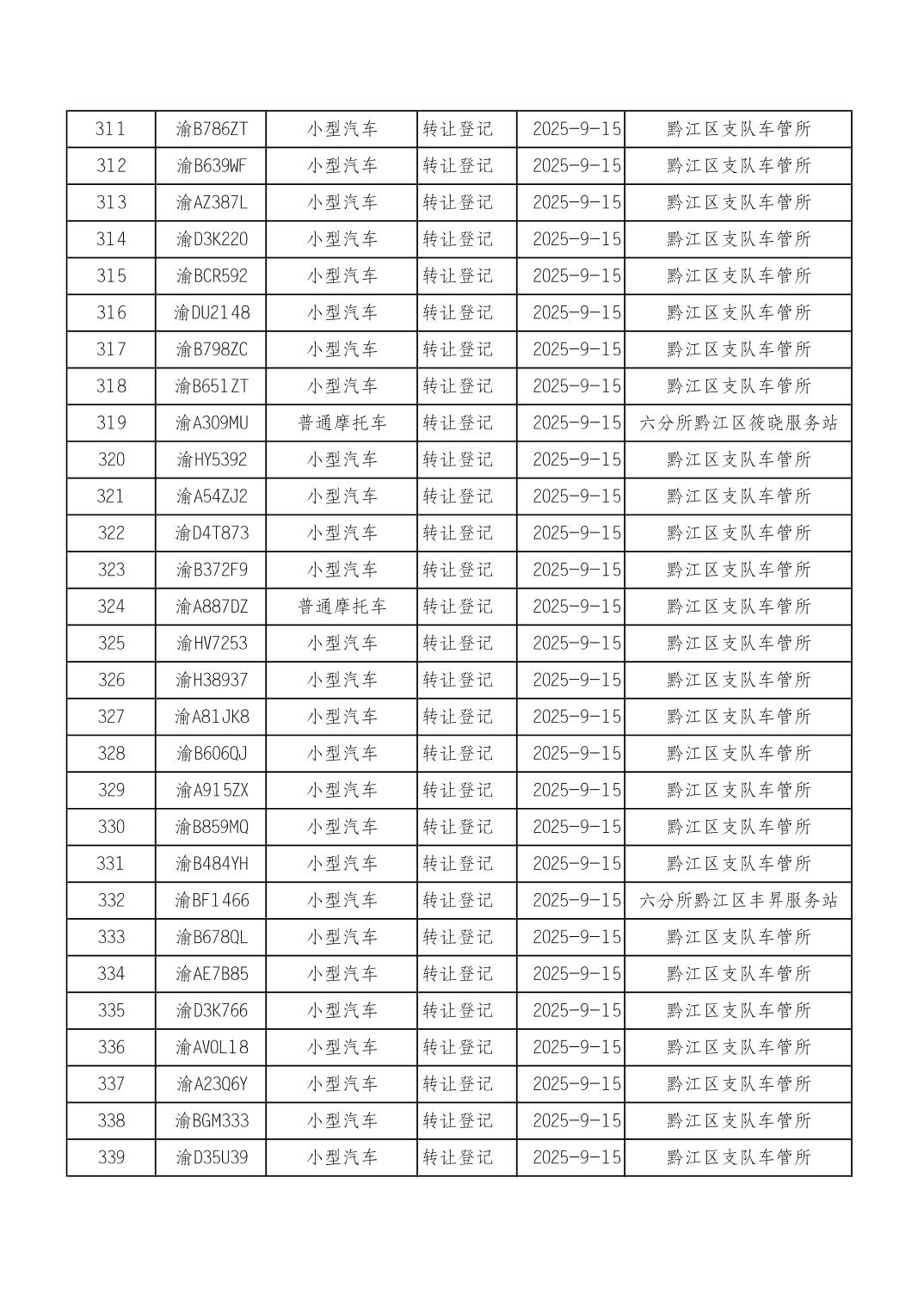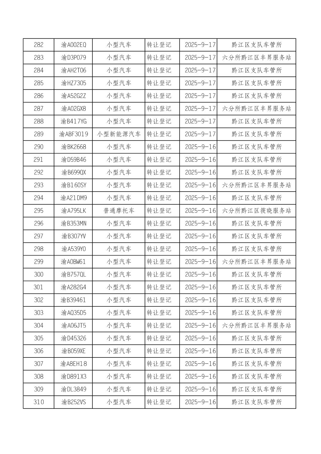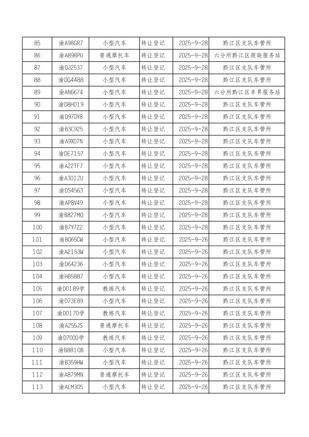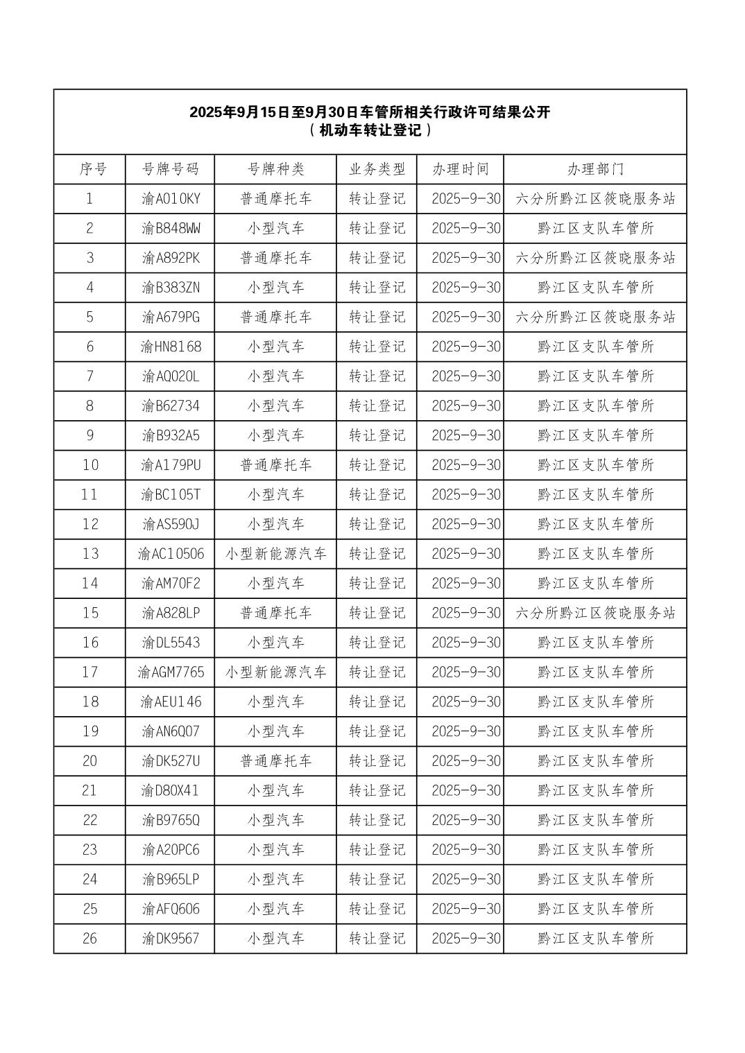 2025年9月15日至9月30日车管所相关行政许可结果公开(机动车转让登记)