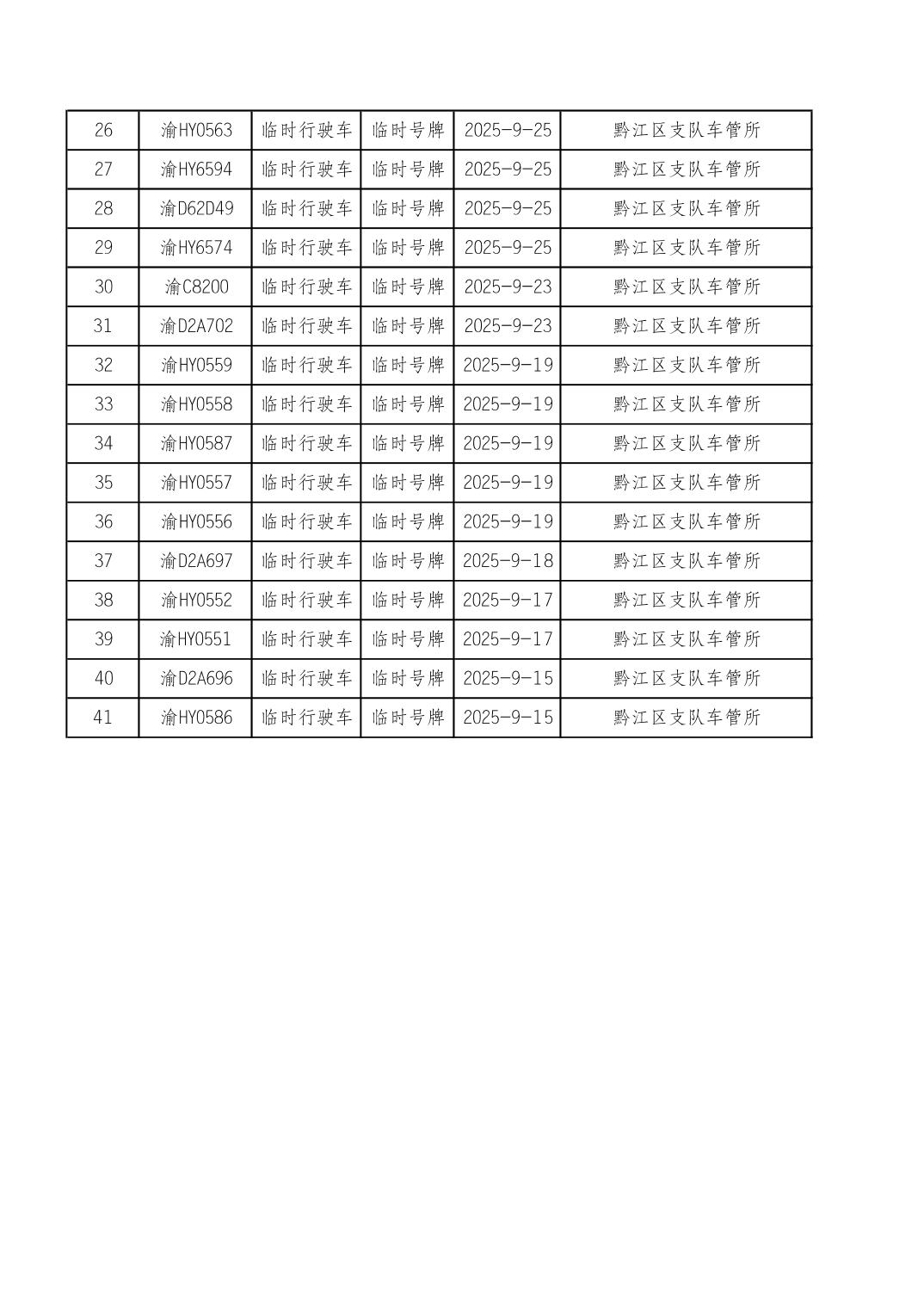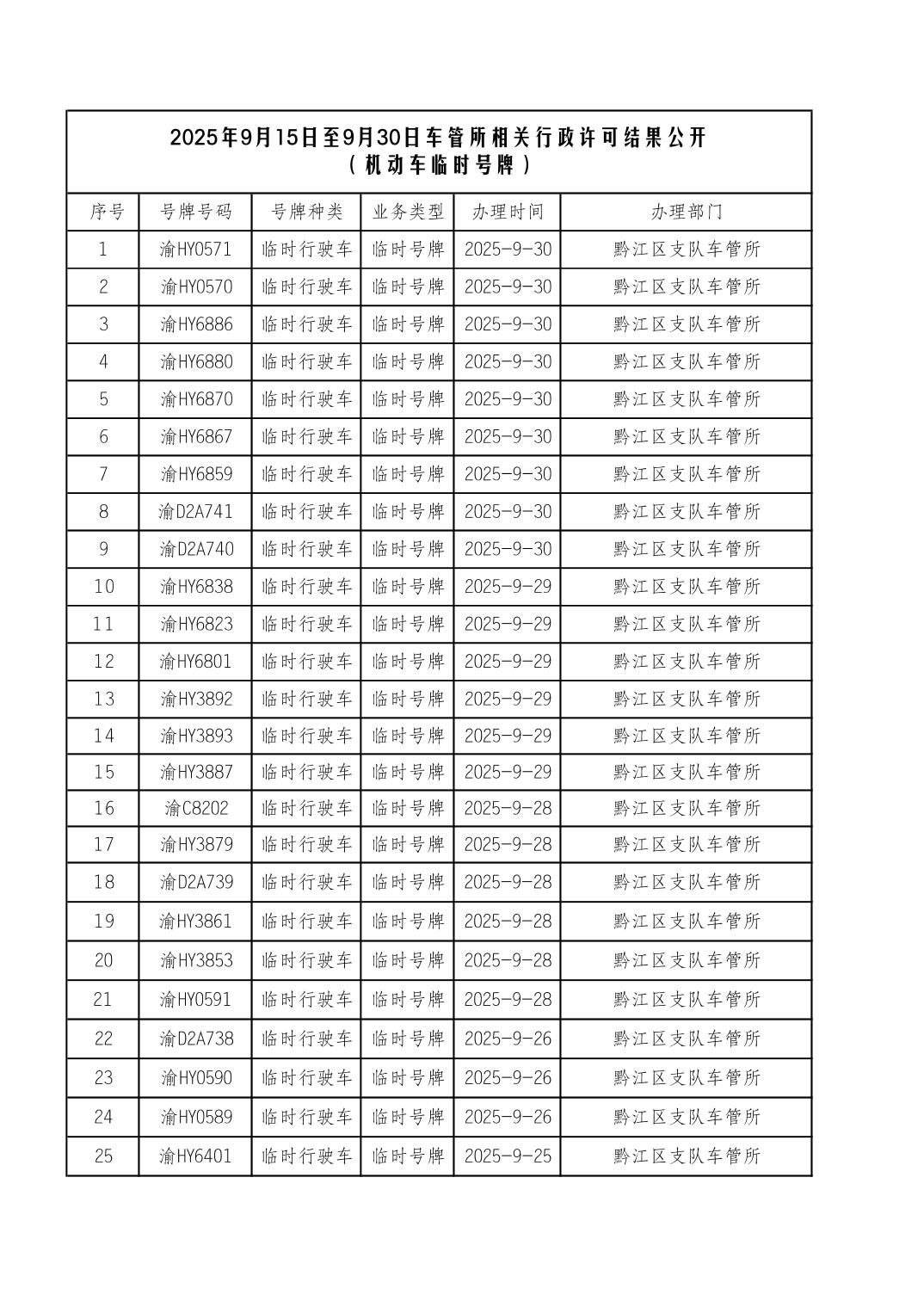 2025年9月15日至9月30日车管所相关行政许可结果公开(机动车临时号牌)