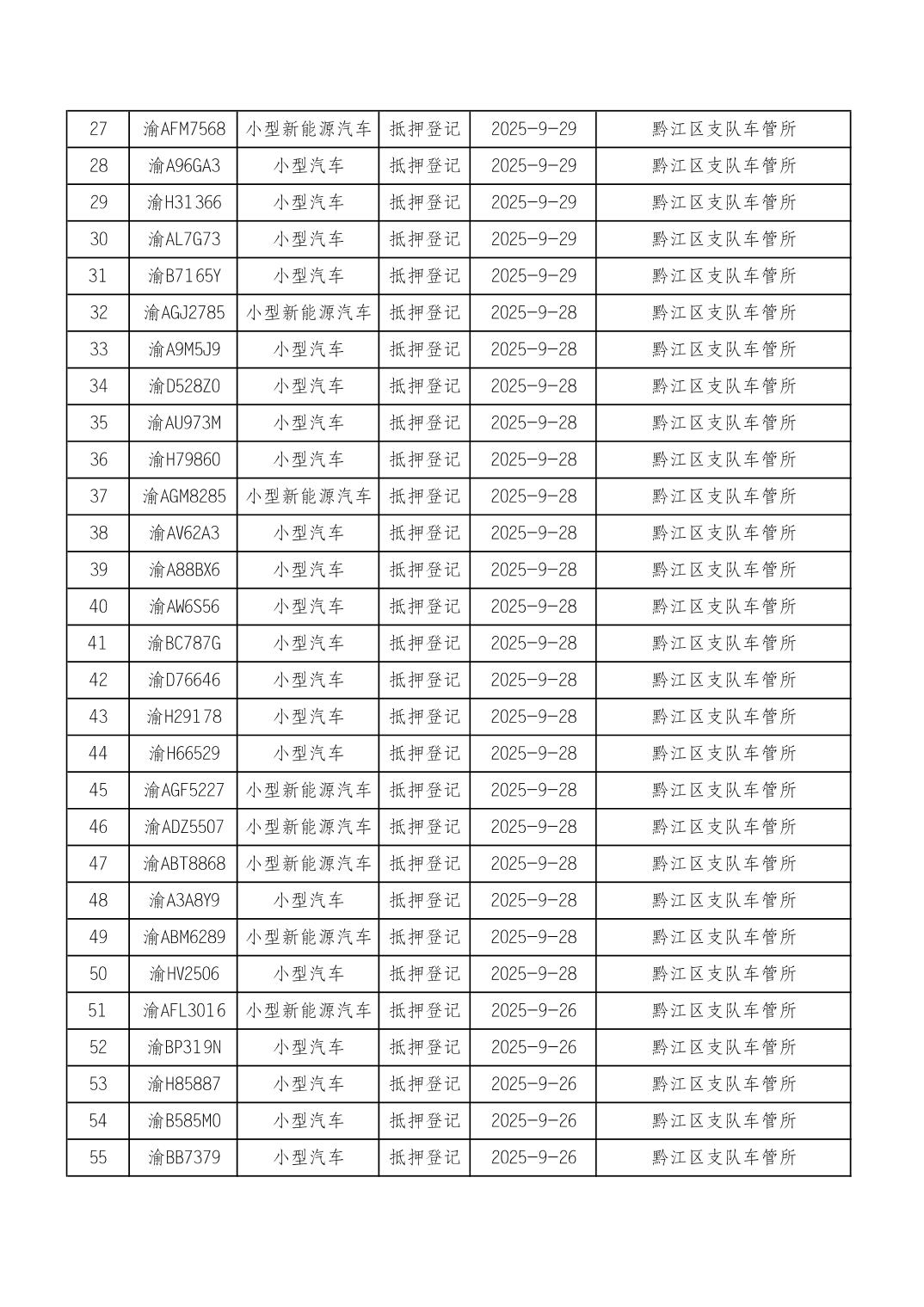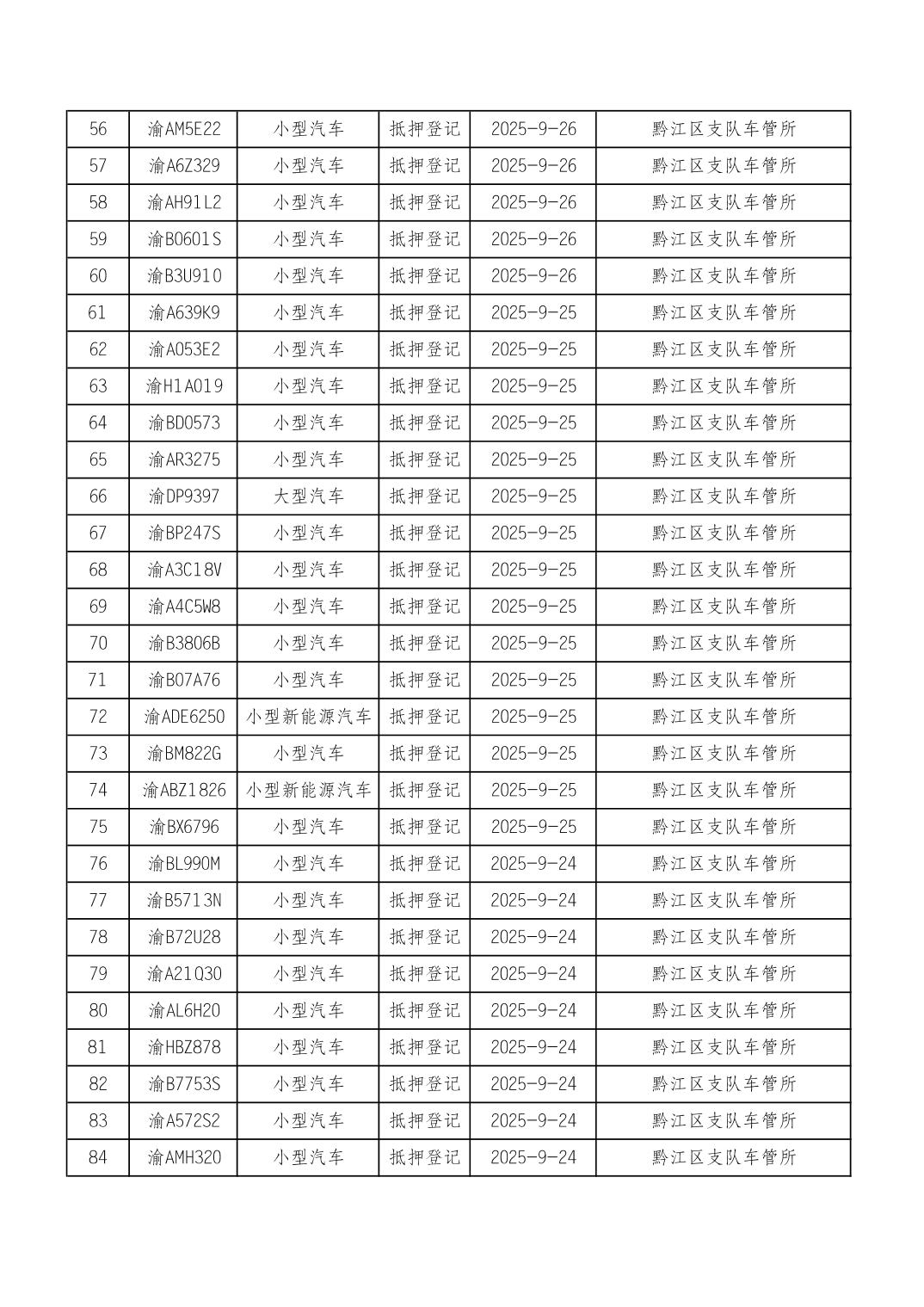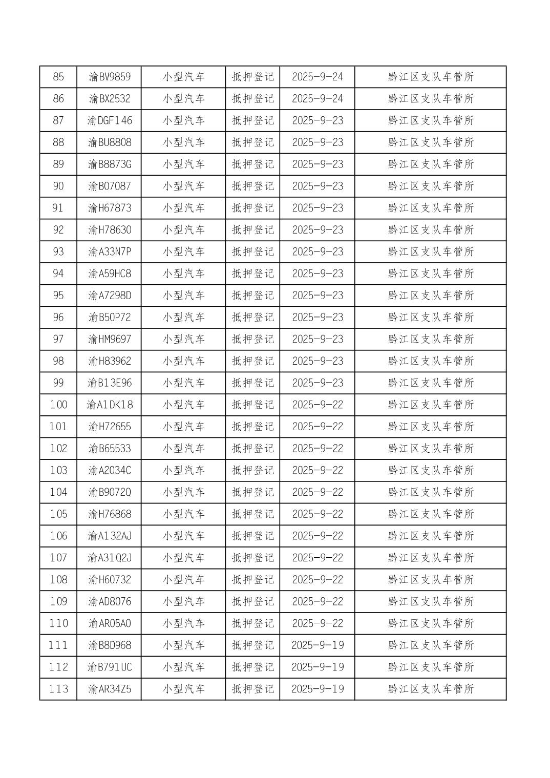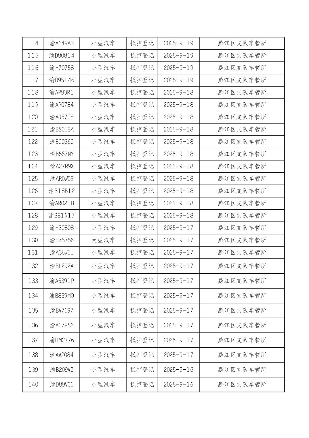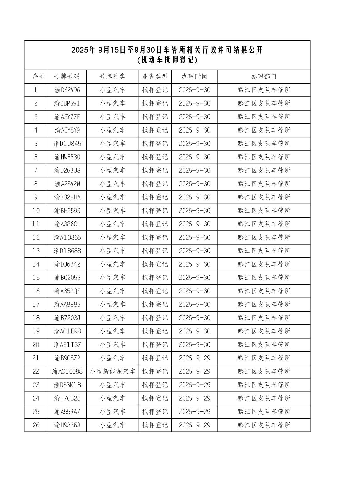 2025年9月15日至9月30日车管所相关行政许可结果公开(机动车抵押登记)