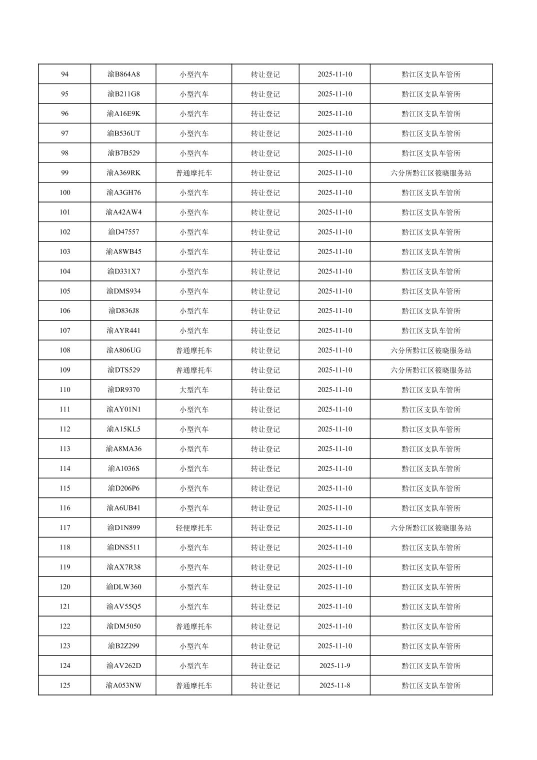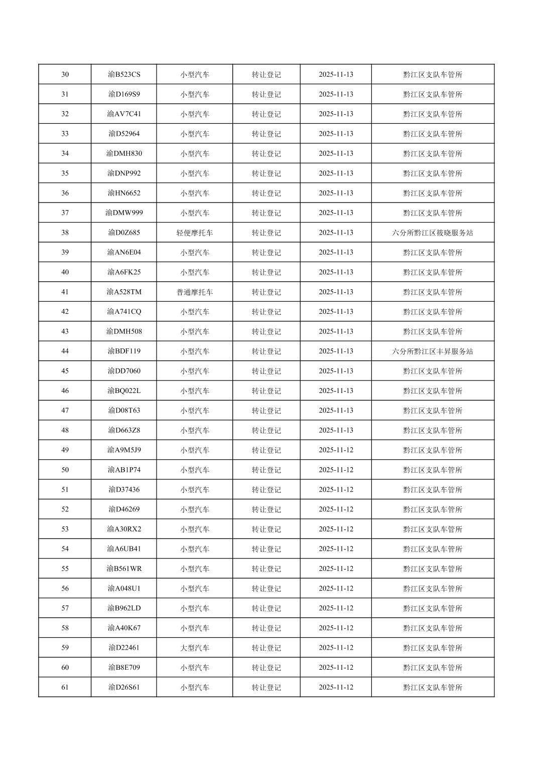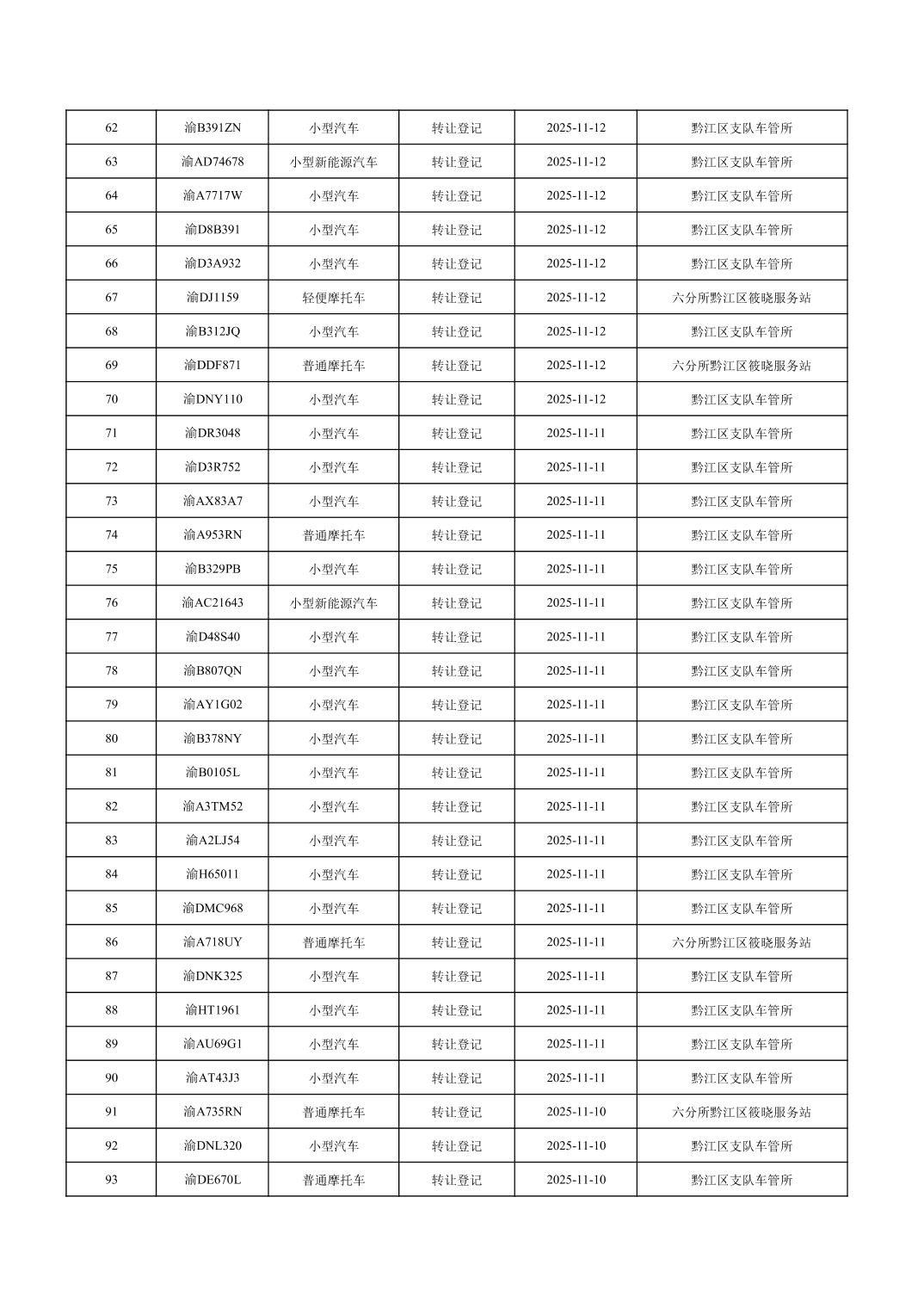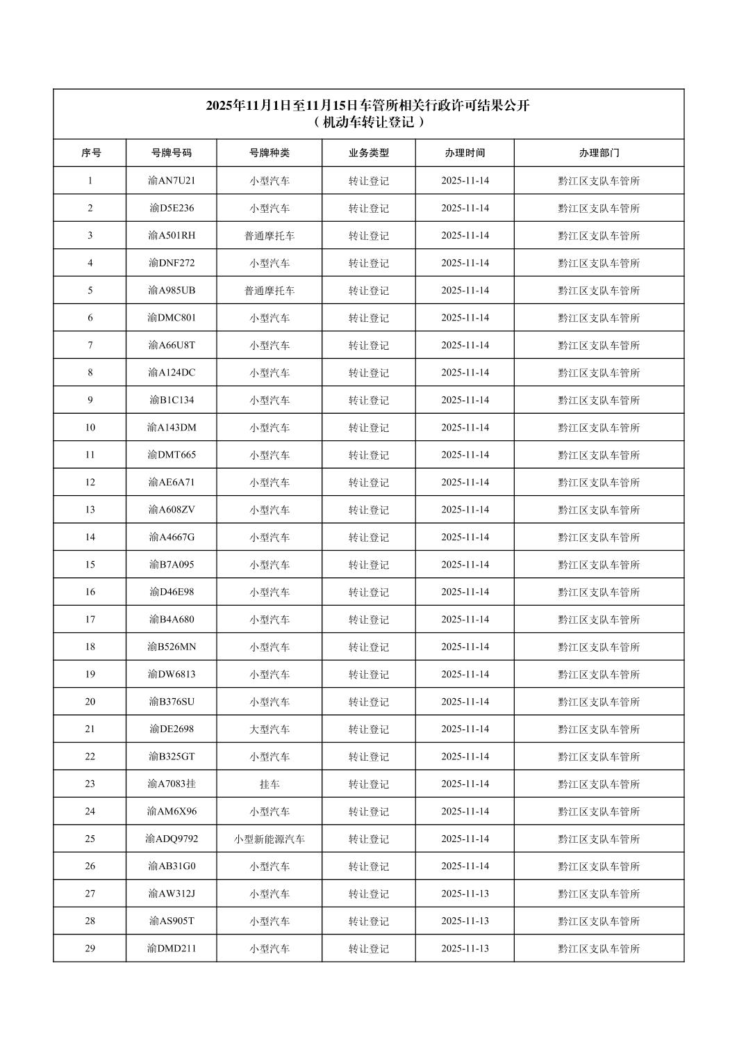 2025年11月1日至11月15日车管所相关行政许可结果公开(机动车转让登记)