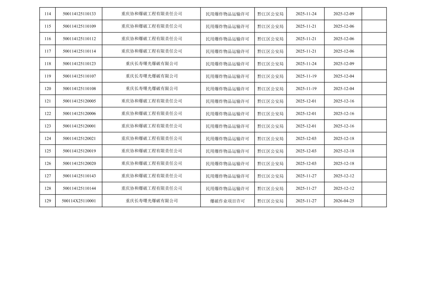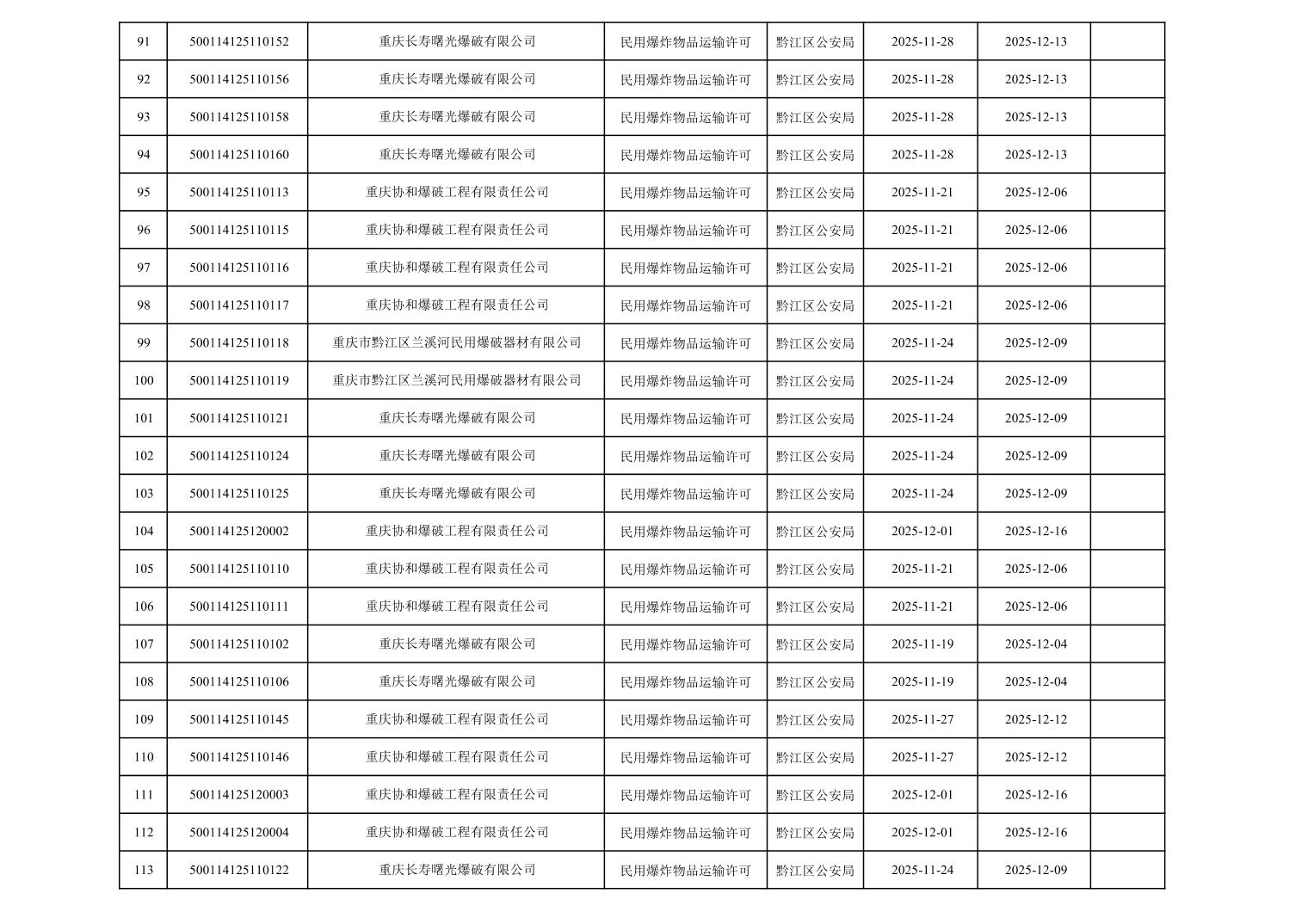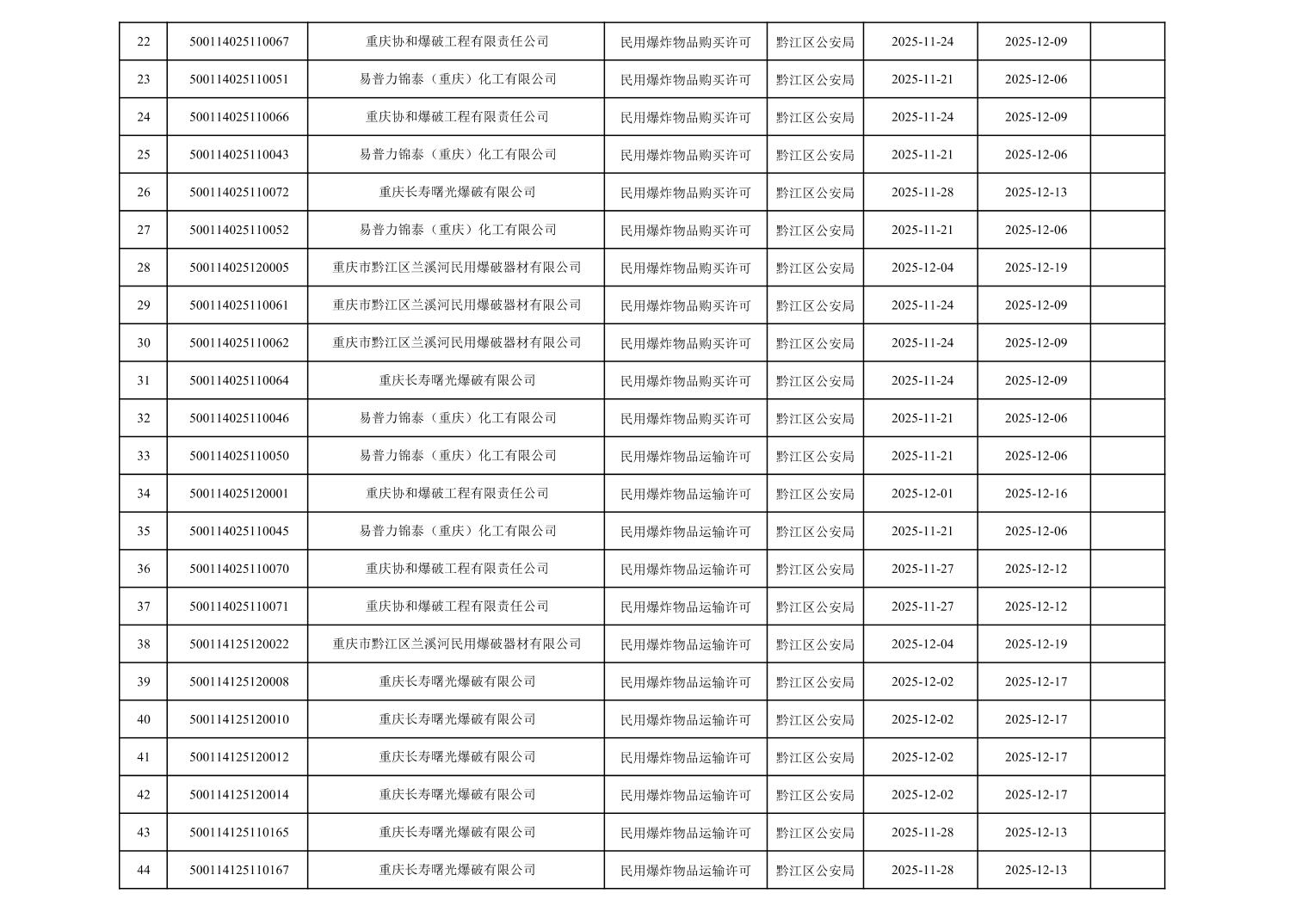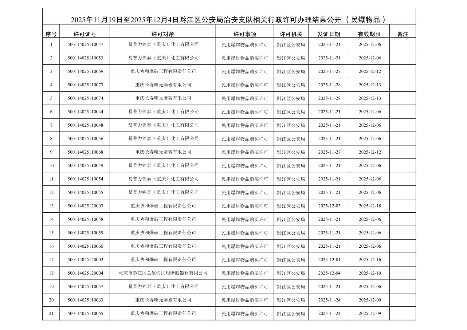 2025年11月19日至2025年12月4日黔江区公安局治安支队相关行政许可办理结果公开(民爆物品)