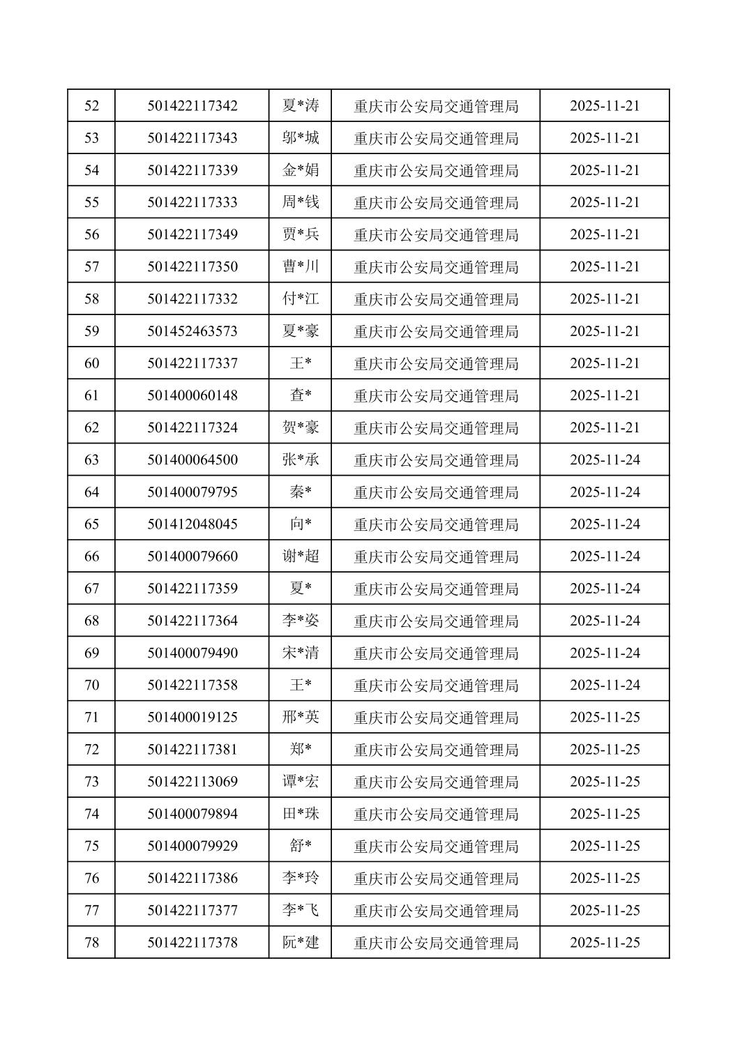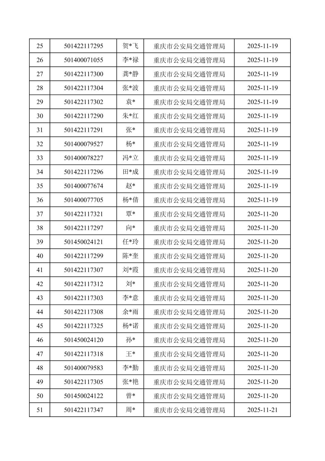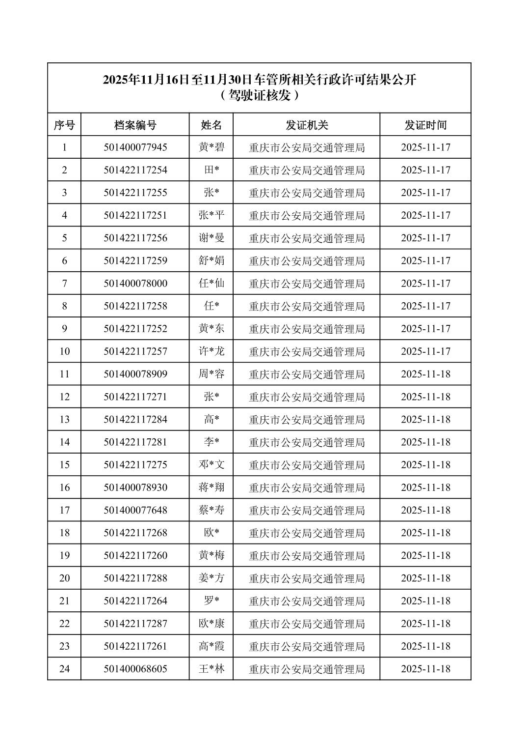 2025年11月16日至11月30日车管所相关行政许可结果公开(驾驶证核发)