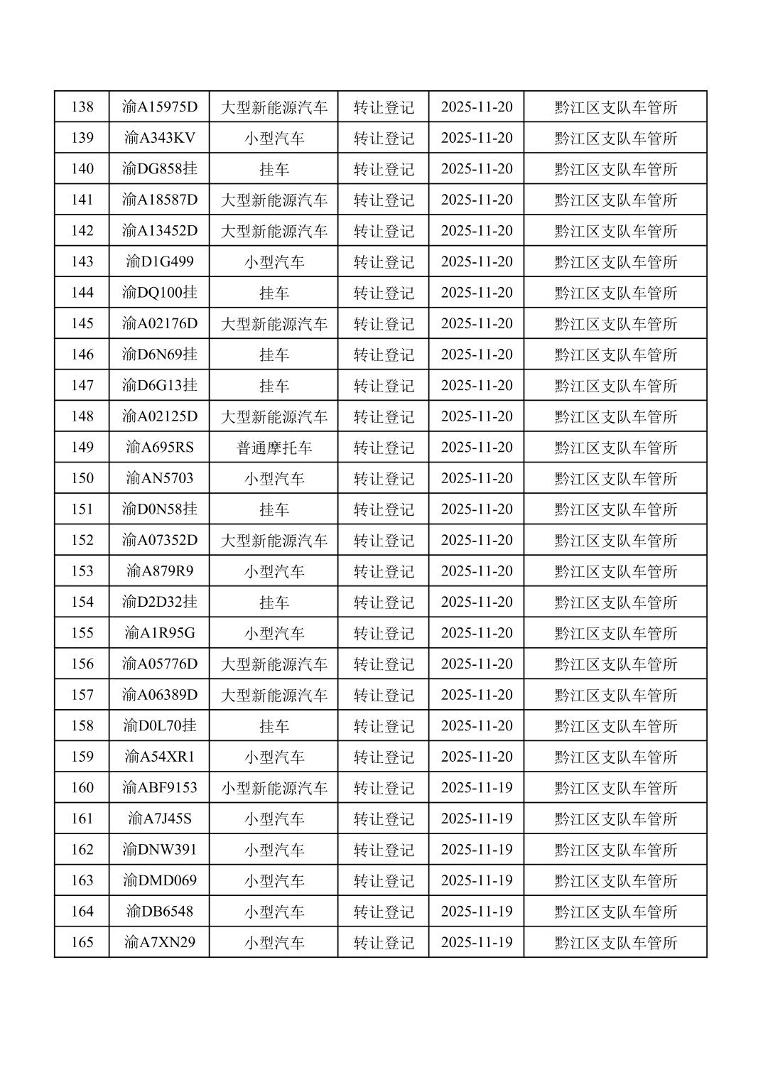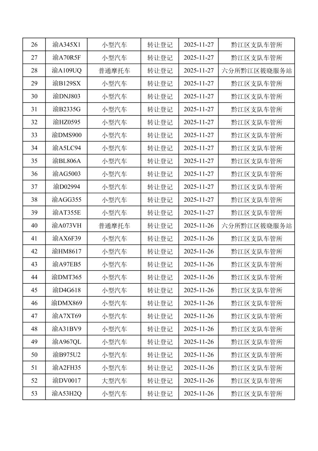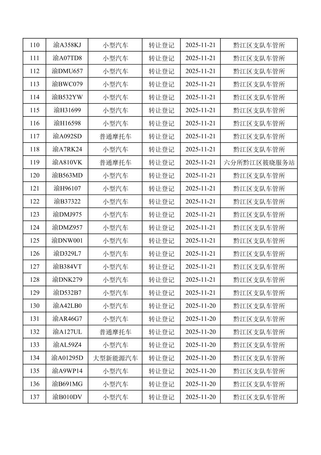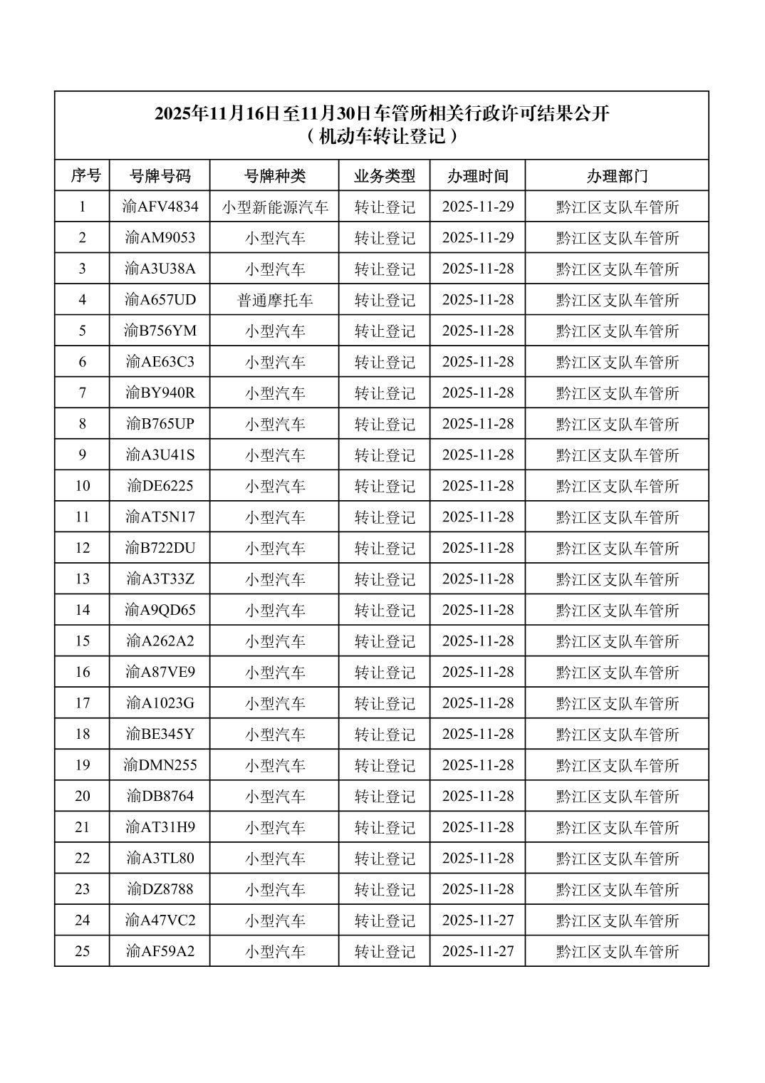 2025年11月16日至11月30日车管所相关行政许可结果公开(机动车转让登记)
