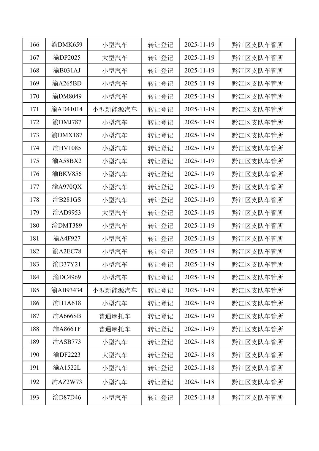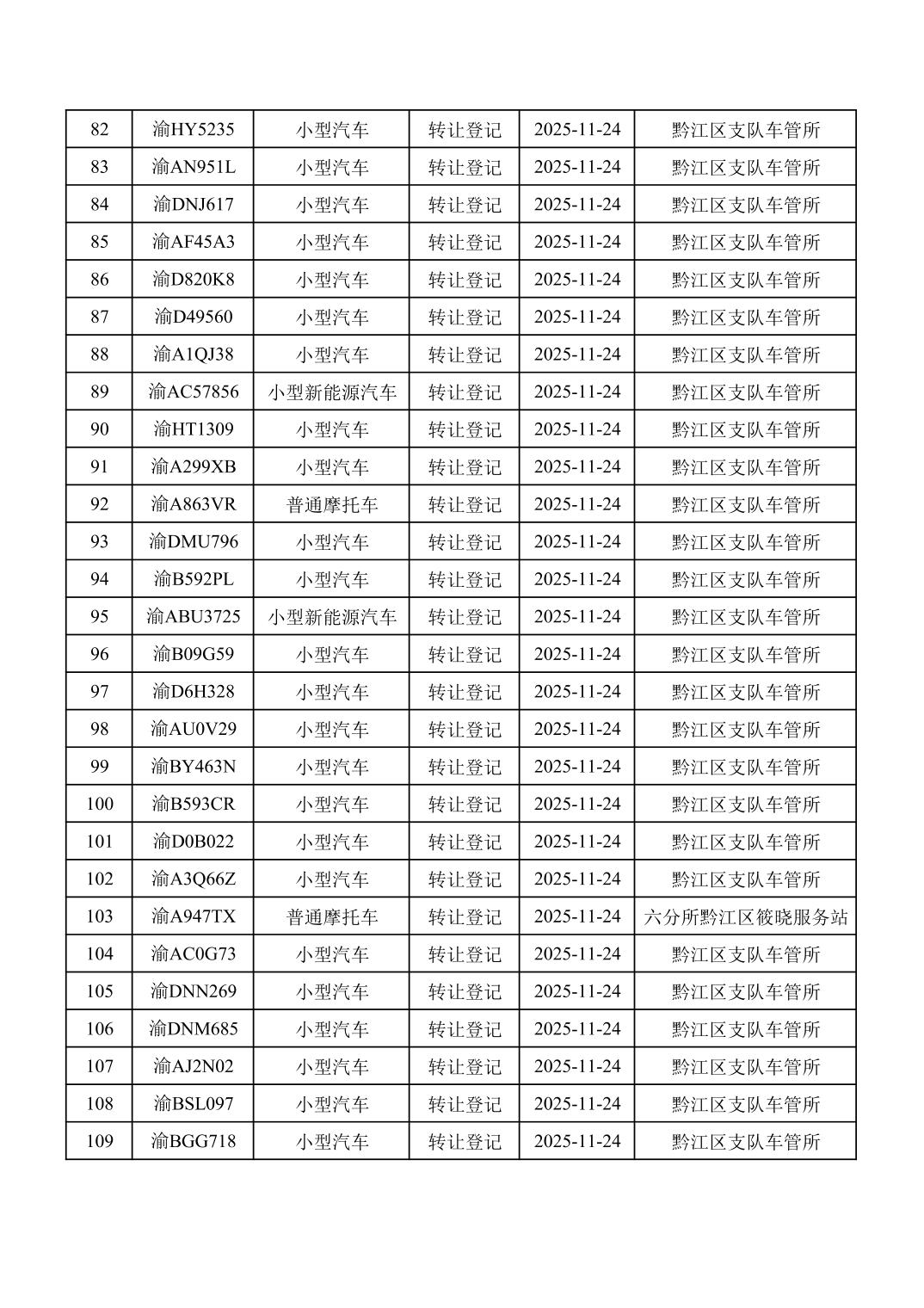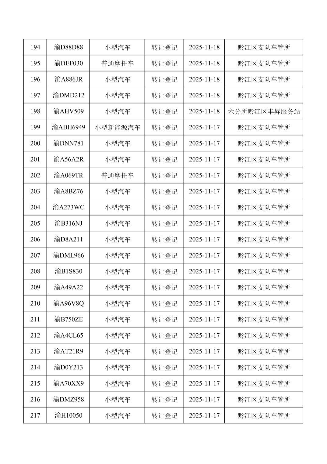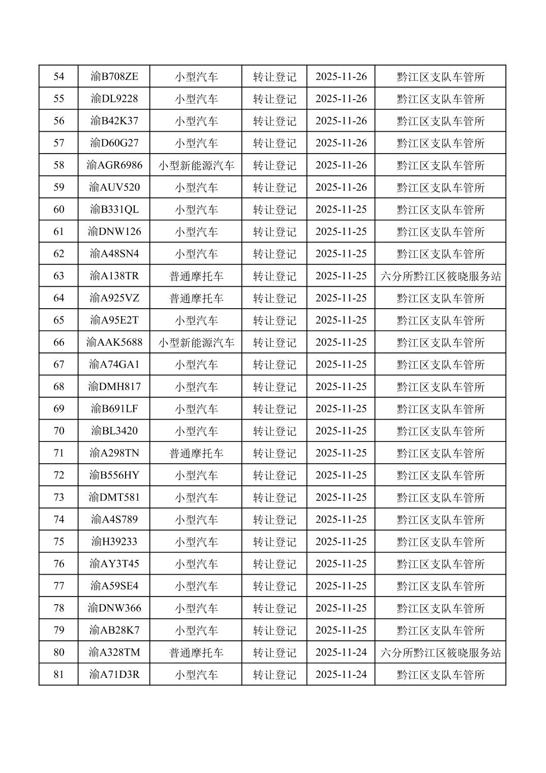 2025年11月16日至11月30日车管所相关行政许可结果公开(机动车转让登记)