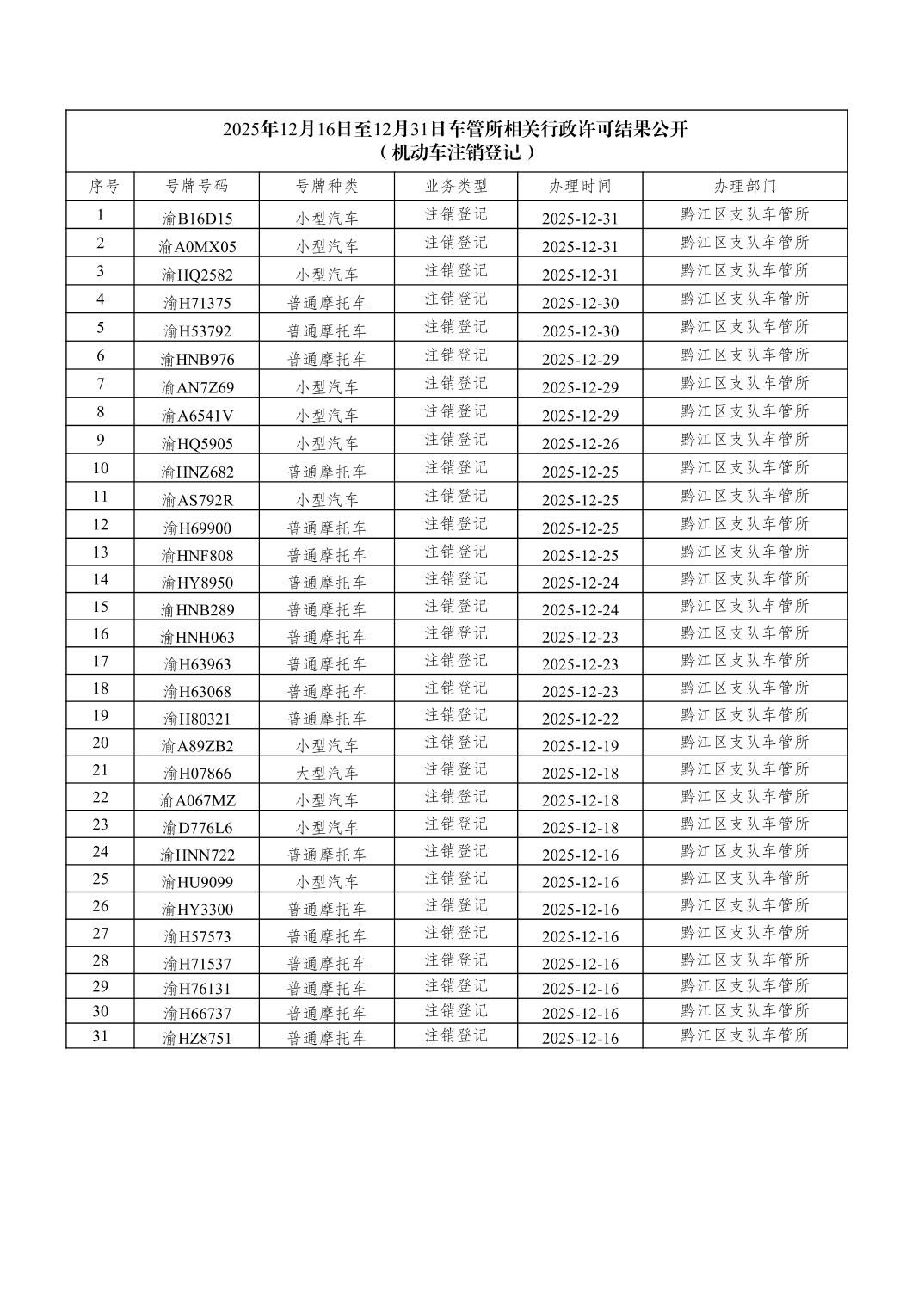 2025年12月16日至12月31日车管所相关行政许可结果公开(机动车注销登记)