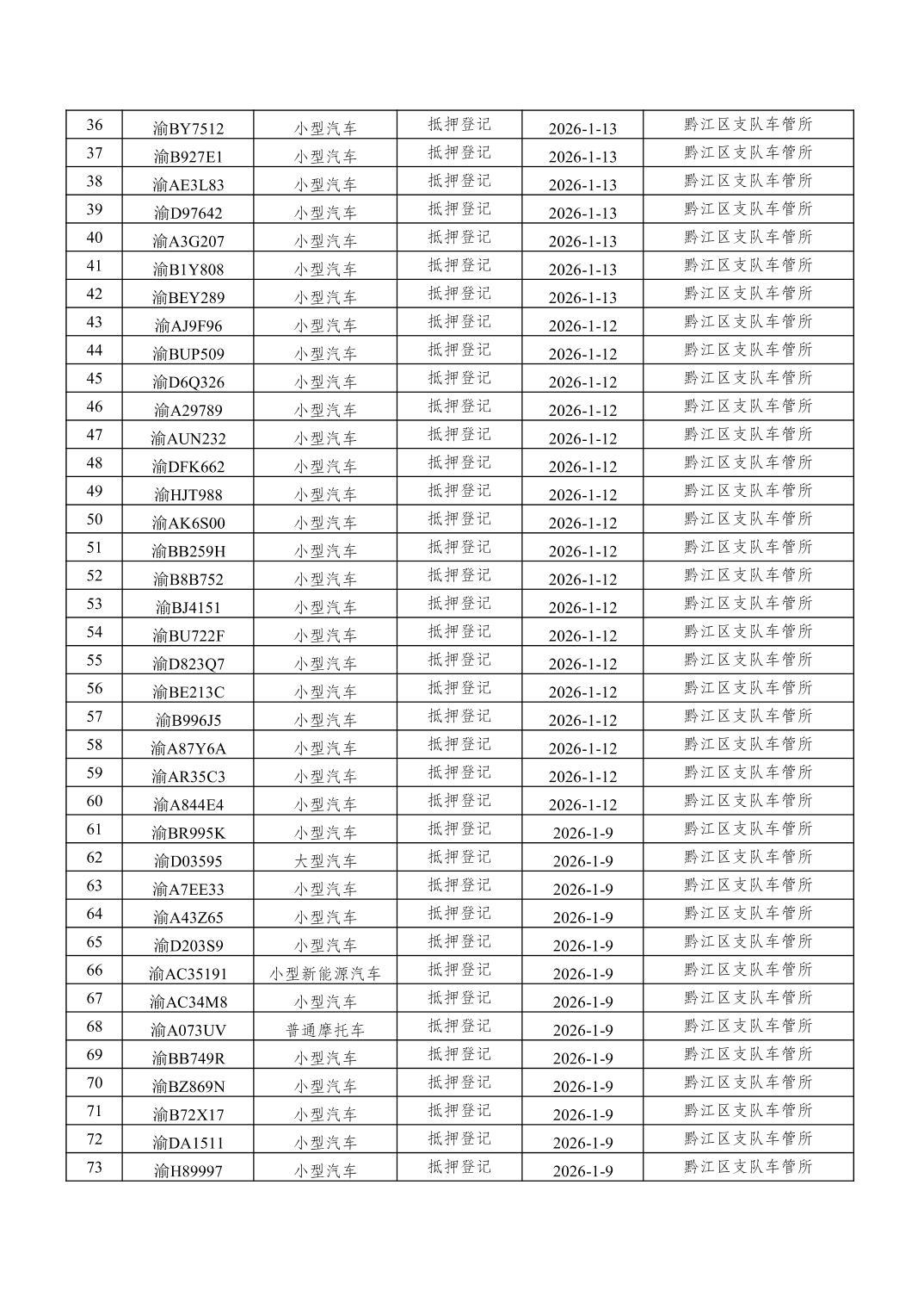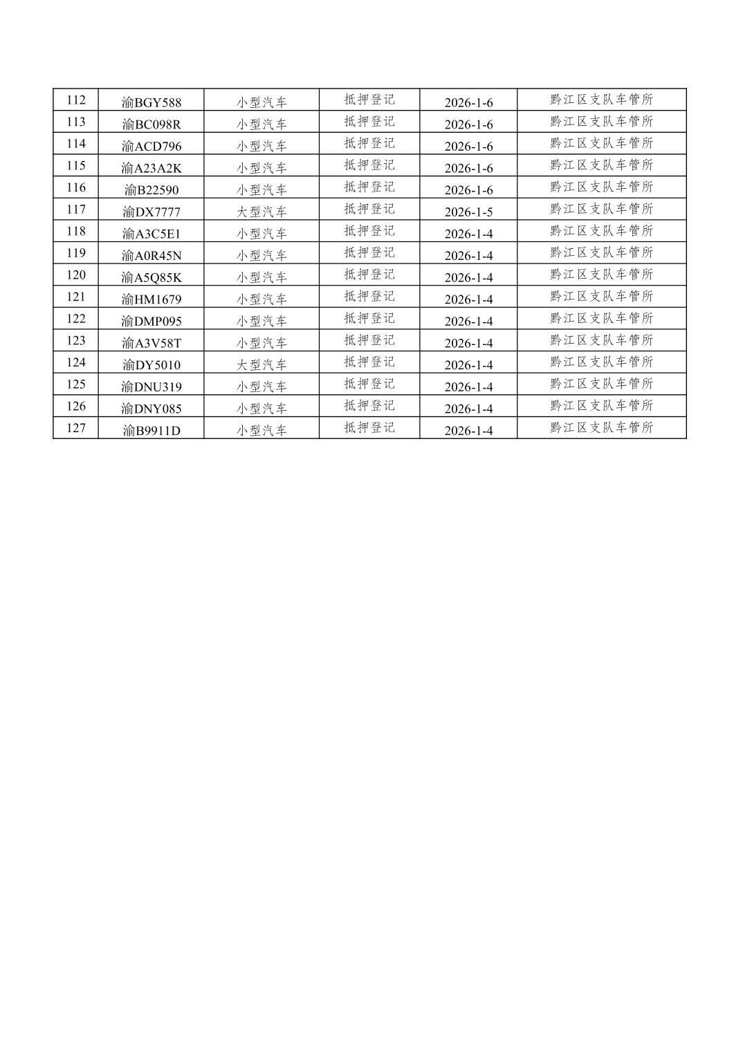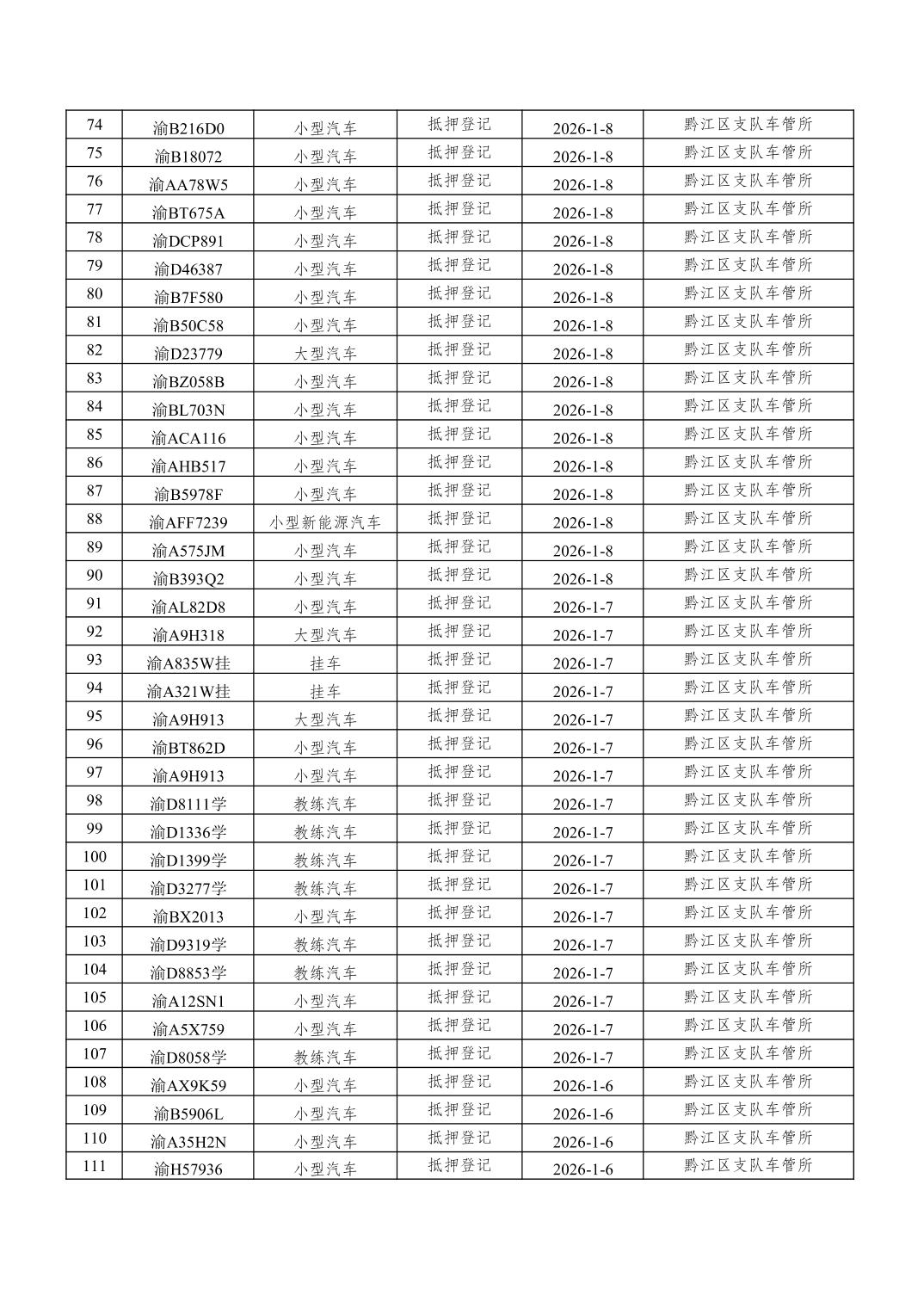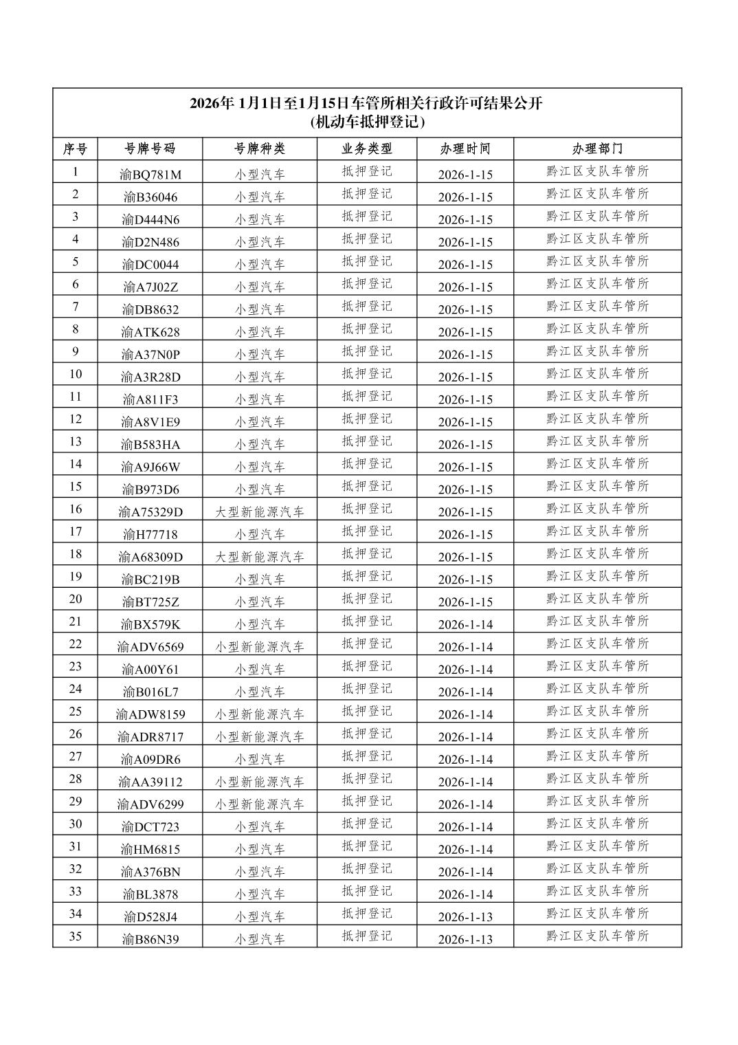 2026年1月1日至1月15日车管所相关行政许可结果公开(机动车抵押登记)