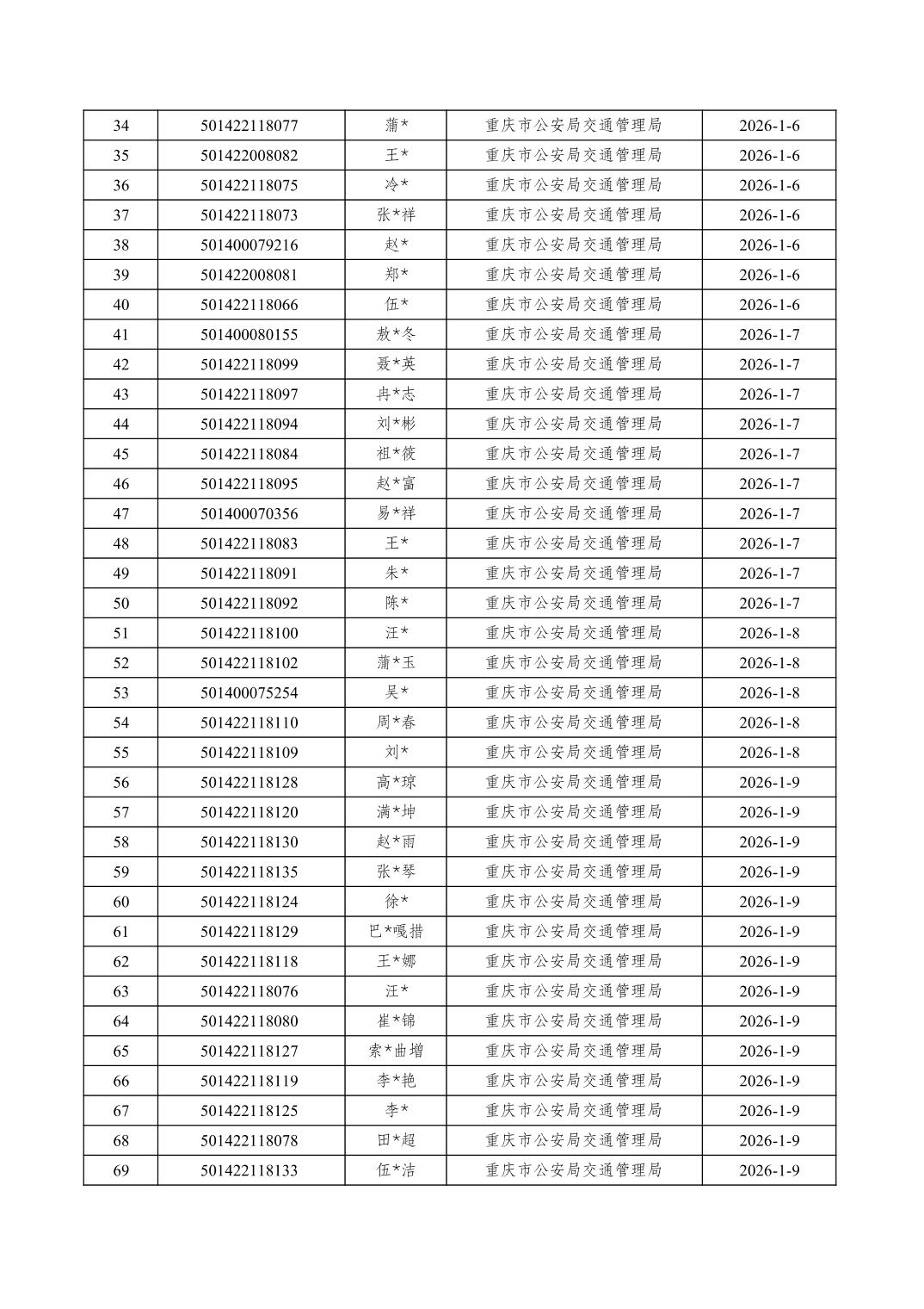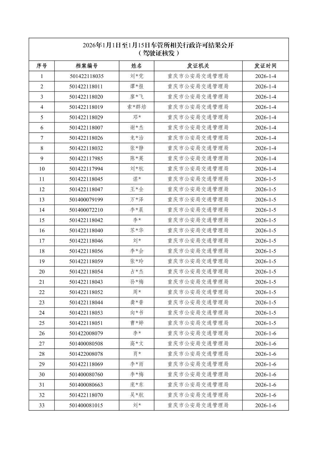 2026年1月1日至1月15日车管所相关行政许可结果公开(驾驶证核发)