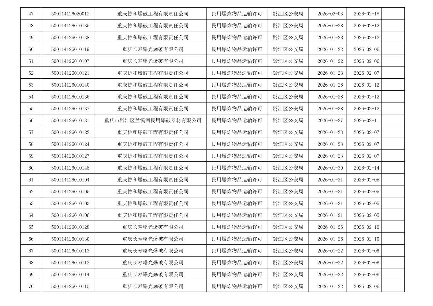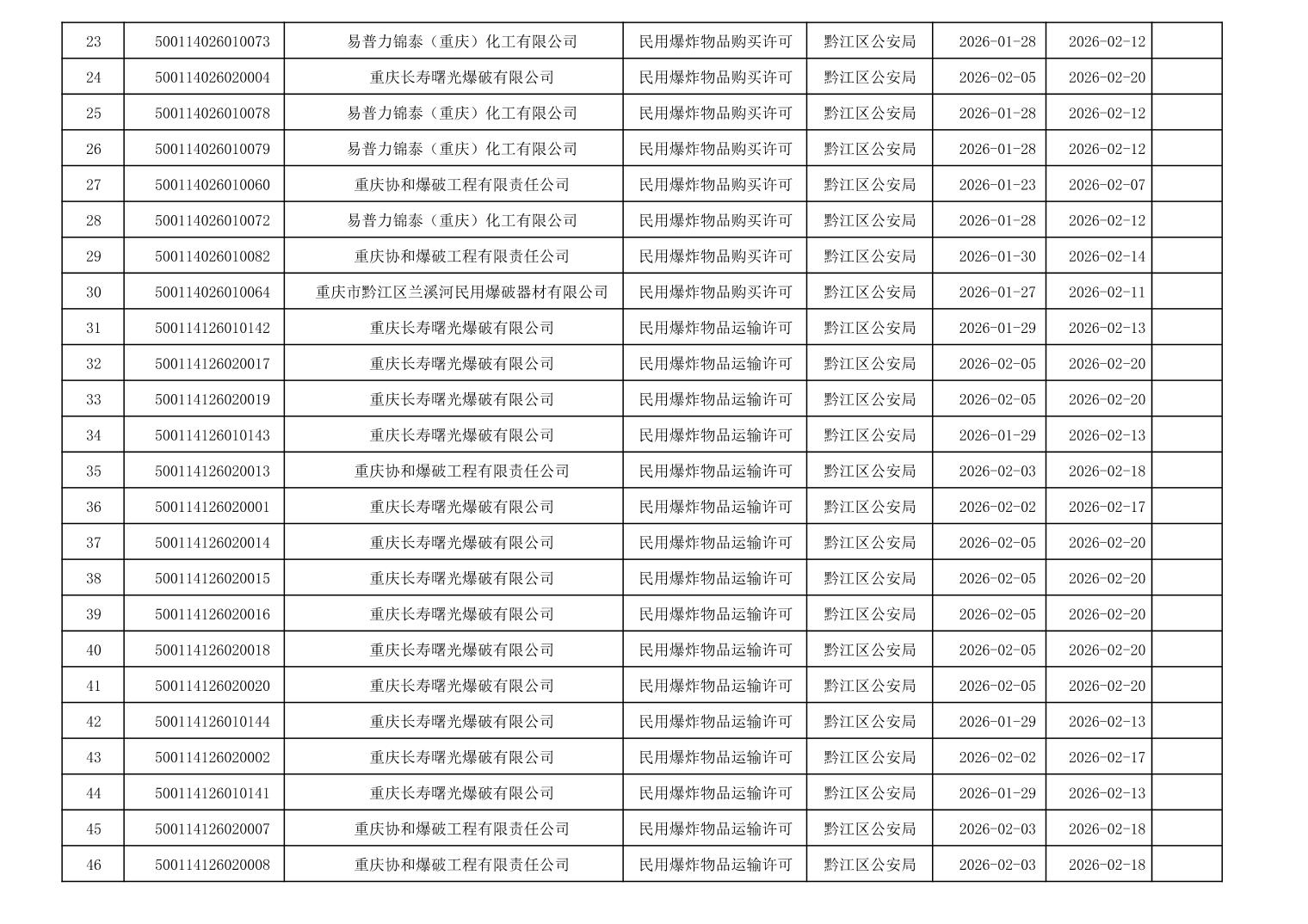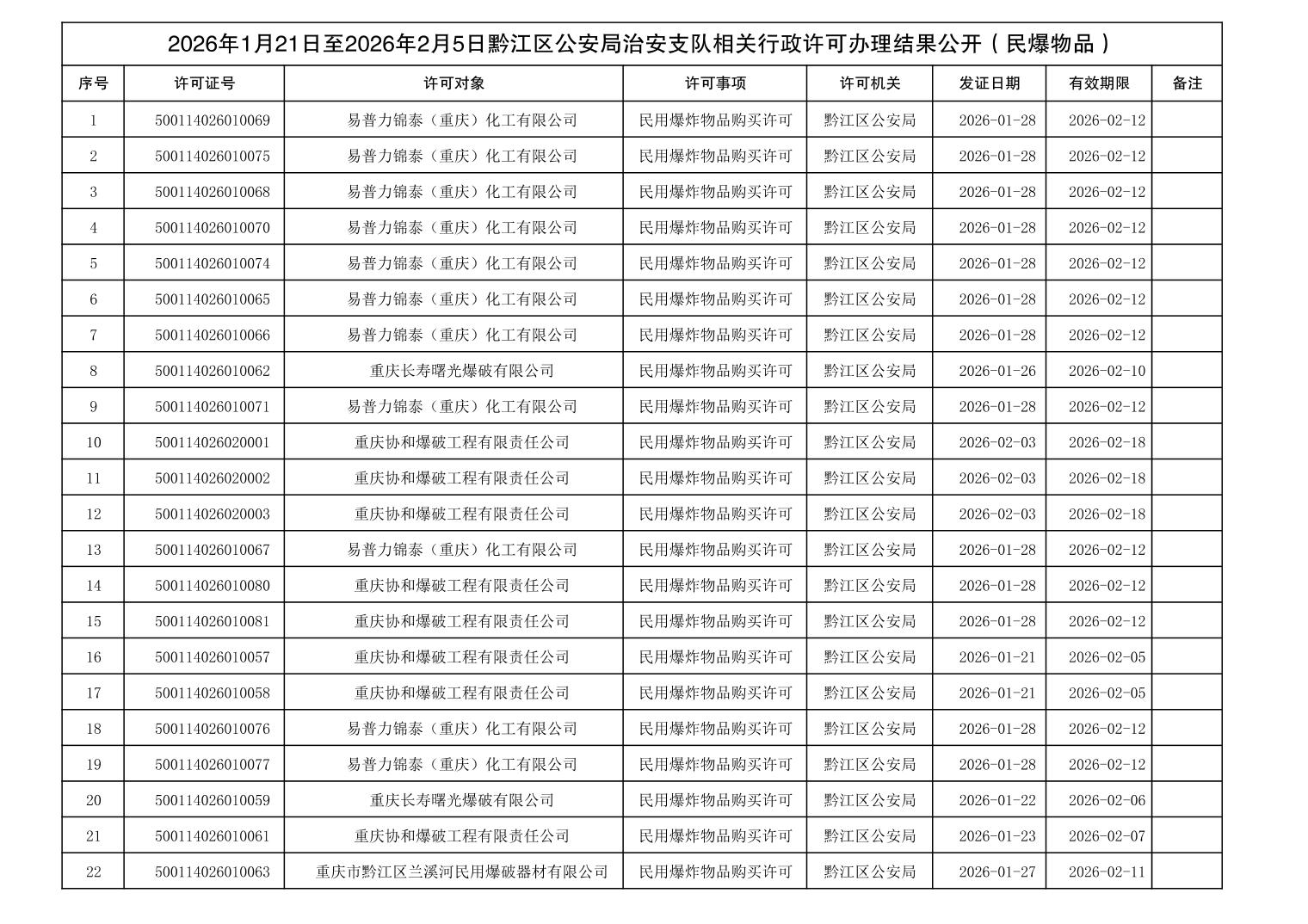 2026年1月21日至2026年2月5日黔江区公安局治安支队相关行政许可办理结果公开(民爆物品)