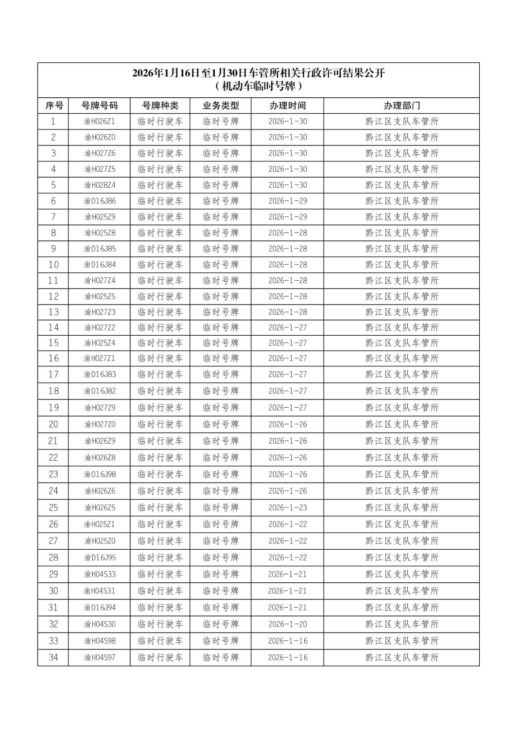 2026年1月16日至1月30日车管所相关行政许可结果公开(机动车临时号牌)