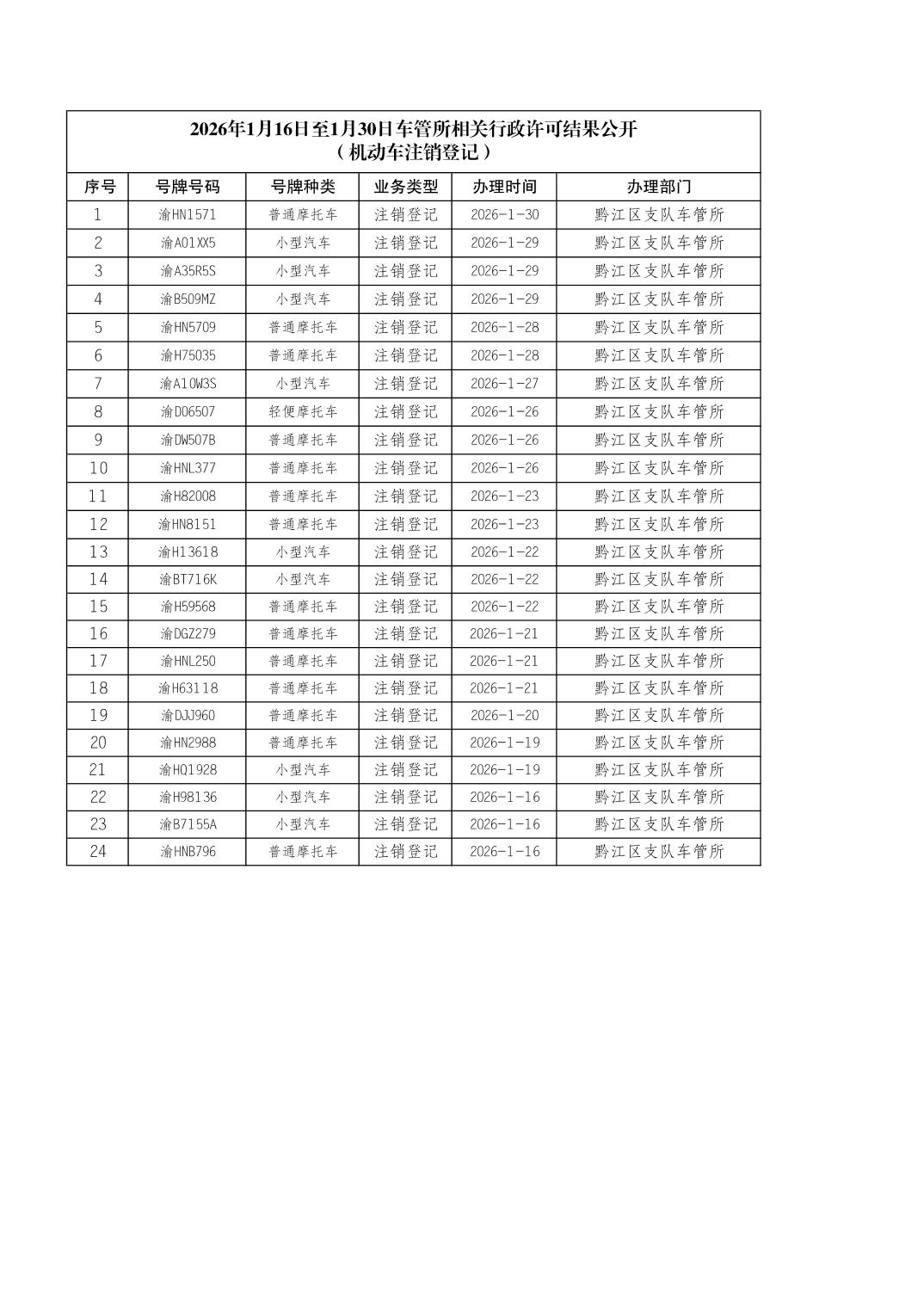 2026年1月16日至1月30日车管所相关行政许可结果公开(机动车注销登记)