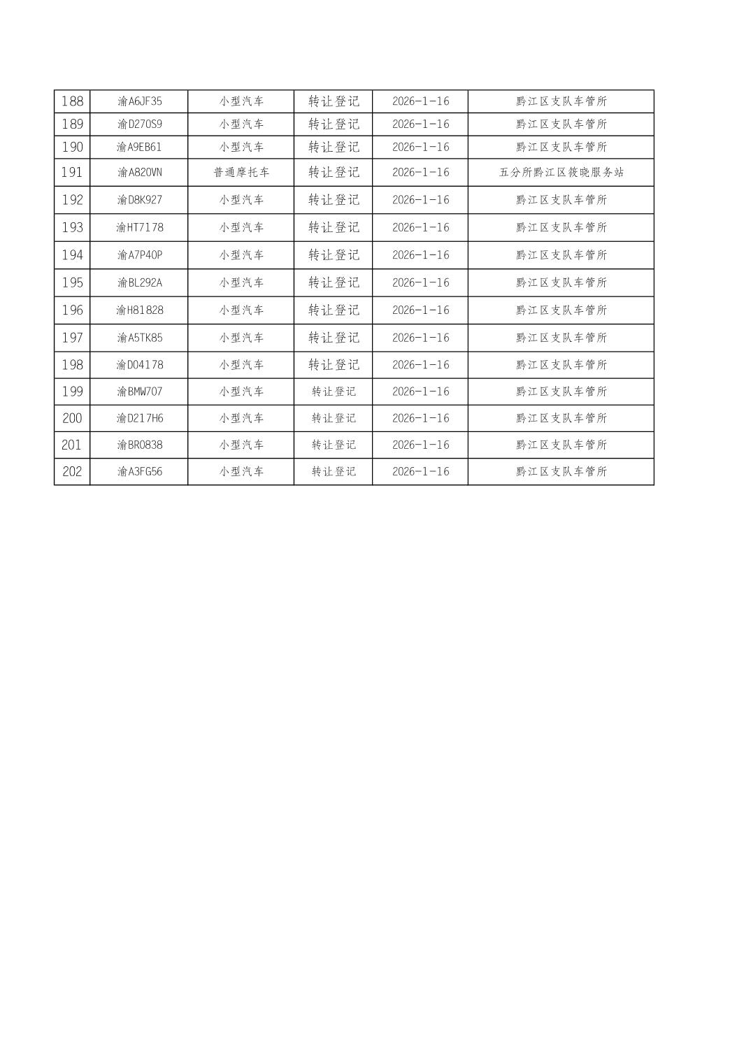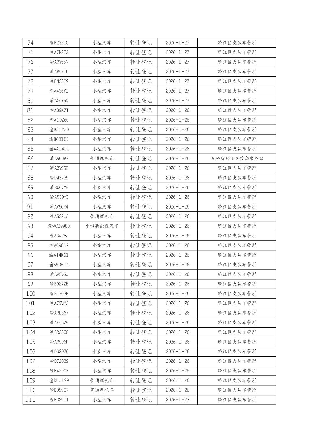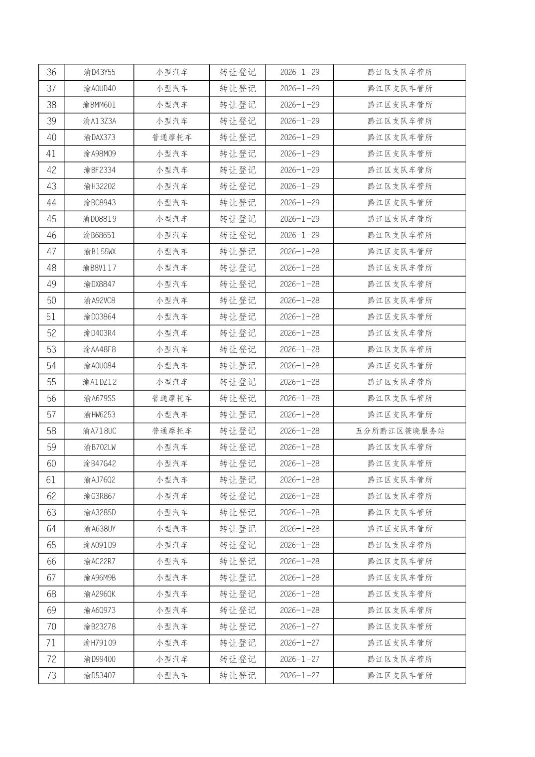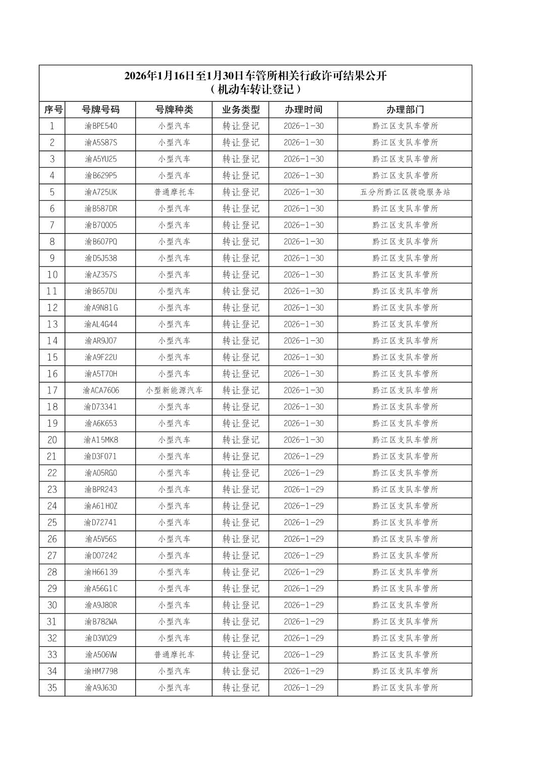 2026年1月16日至1月30日车管所相关行政许可结果公开(机动车转让登记)