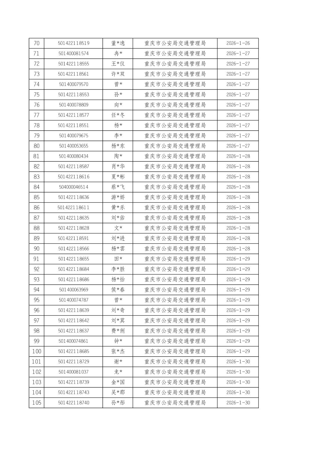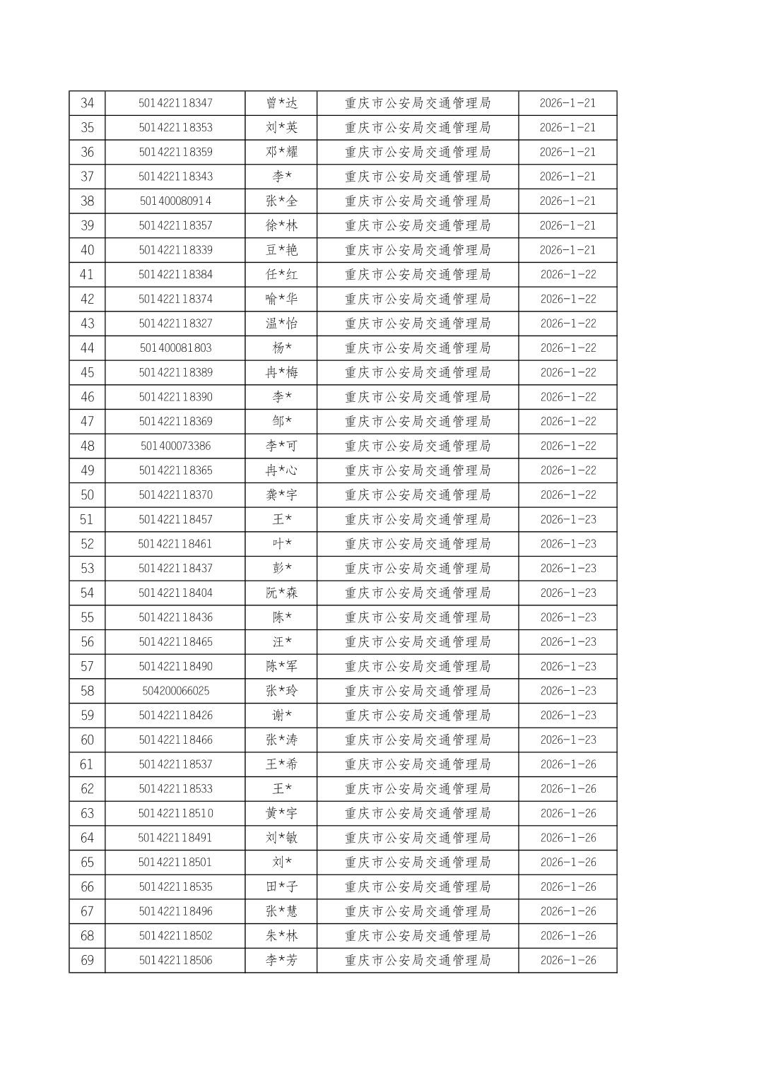 2026年1月16日至1月30日车管所相关行政许可结果公开(驾驶证核发)