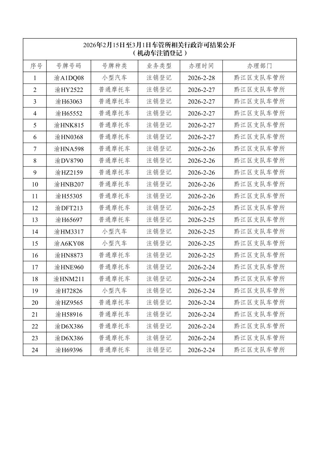 2026年2月15日至3月1日车管所相关行政许可结果公开(机动车注销登记)
