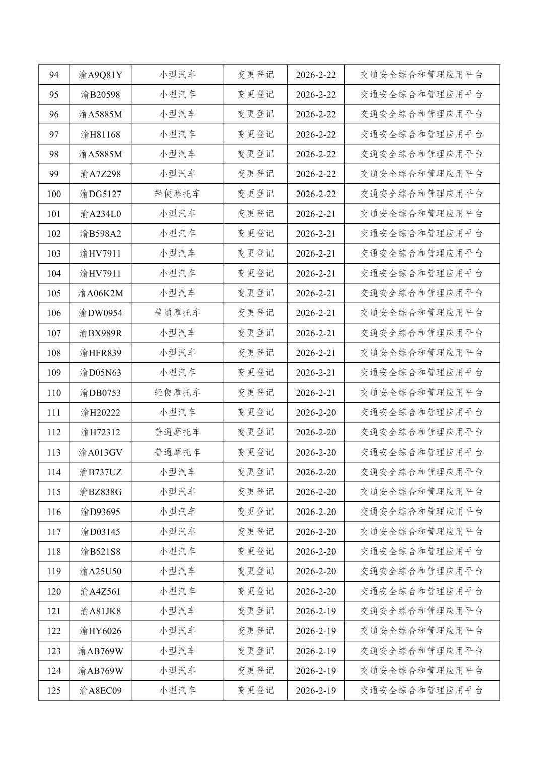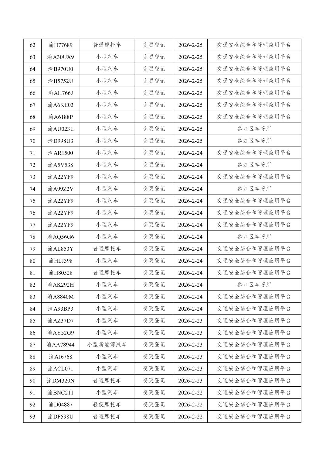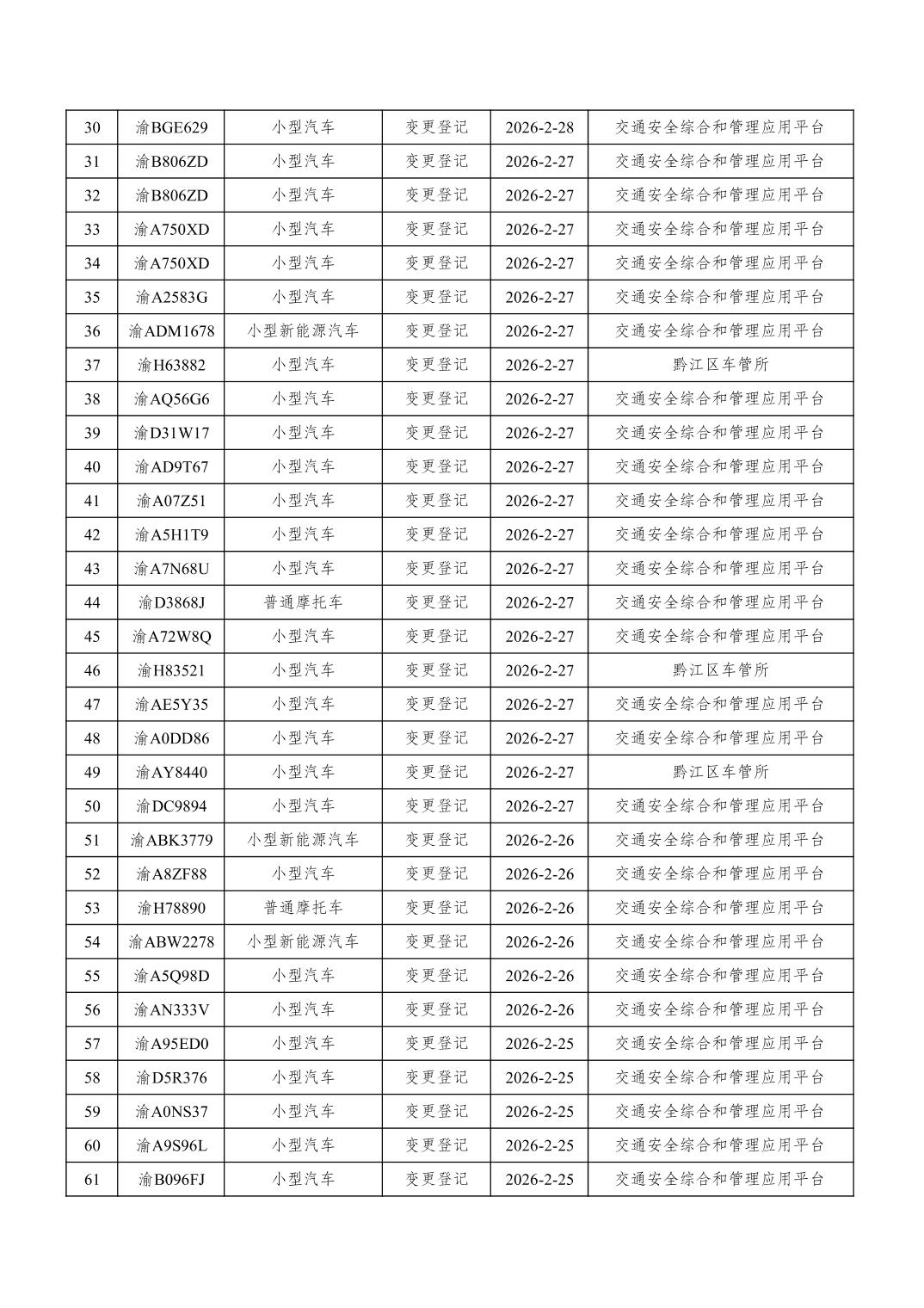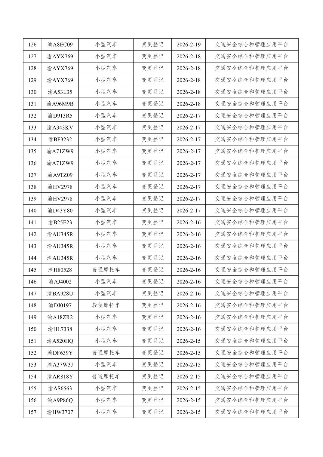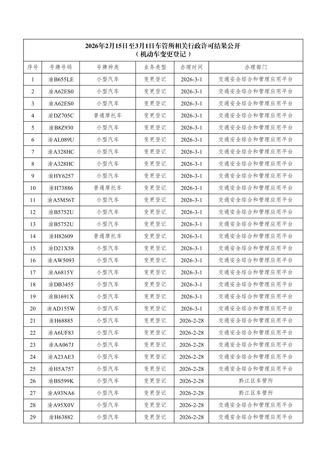 2026年2月15日至3月1日车管所相关行政许可结果公开(机动车变更登记)