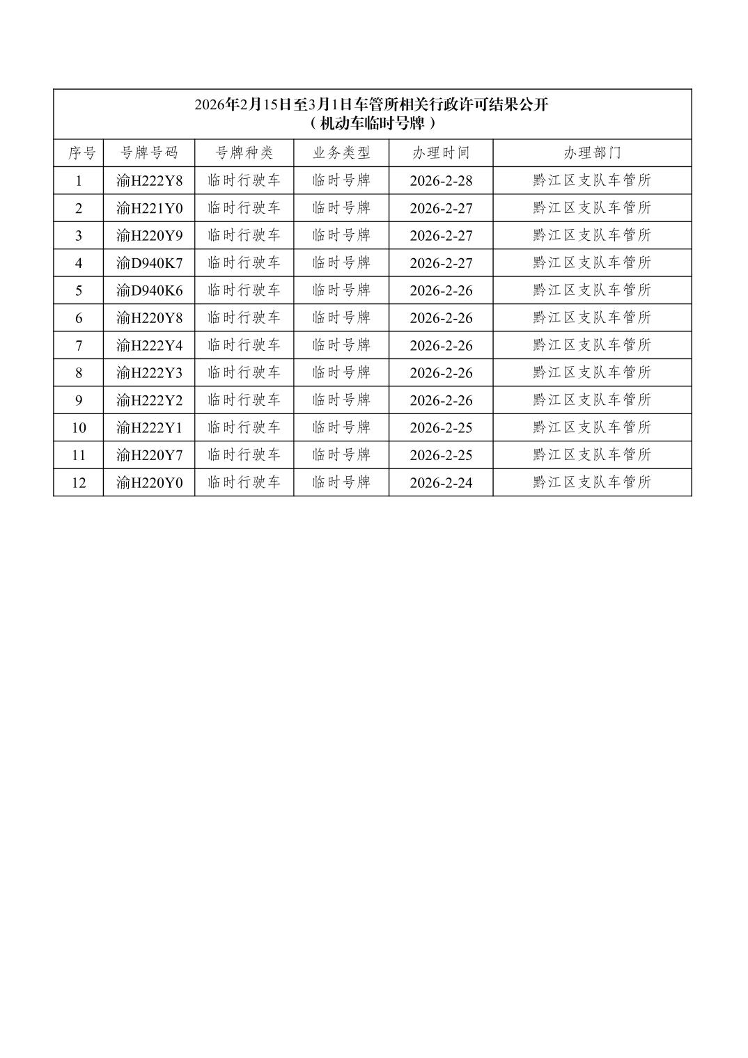 2026年2月15日至3月1日车管所相关行政许可结果公开(机动车临时号牌)