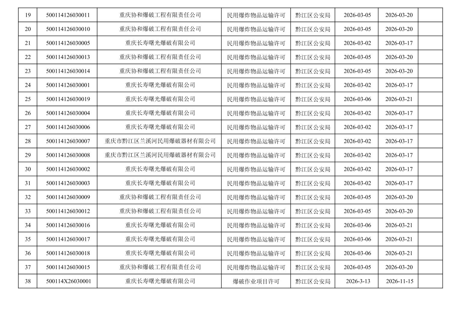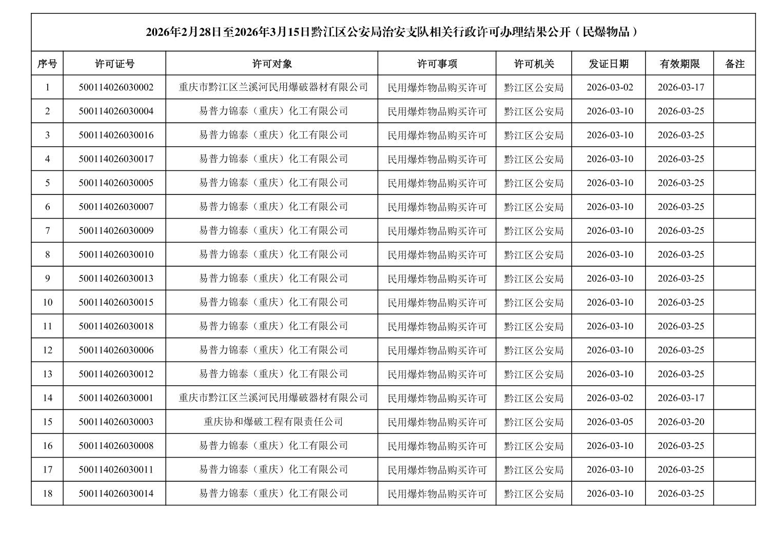 2026年2月28日至2026年3月15日黔江区公安局治安支队相关行政许可办理结果公开(民爆物品)