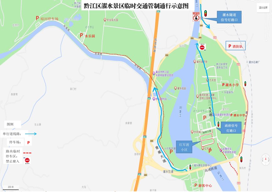 (一)交通管制期间,请市民及游客提前做好规划,合理选择出行方式,尽量错峰出行。濯水古镇停车位有限,请将车辆停放在游客中心停车场,乘坐摆渡车前往古镇游览。