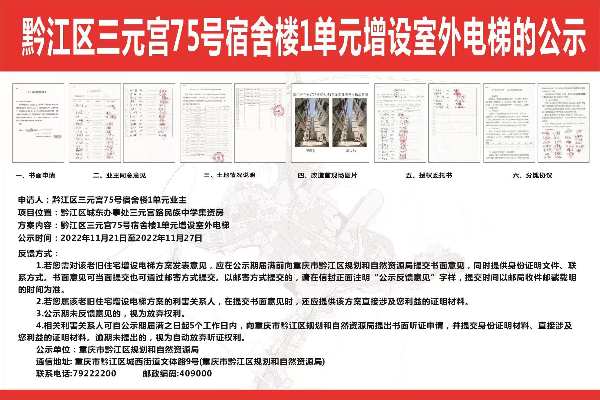 黔江区三元宫75号宿舍楼1单元增设电梯的公告及公示