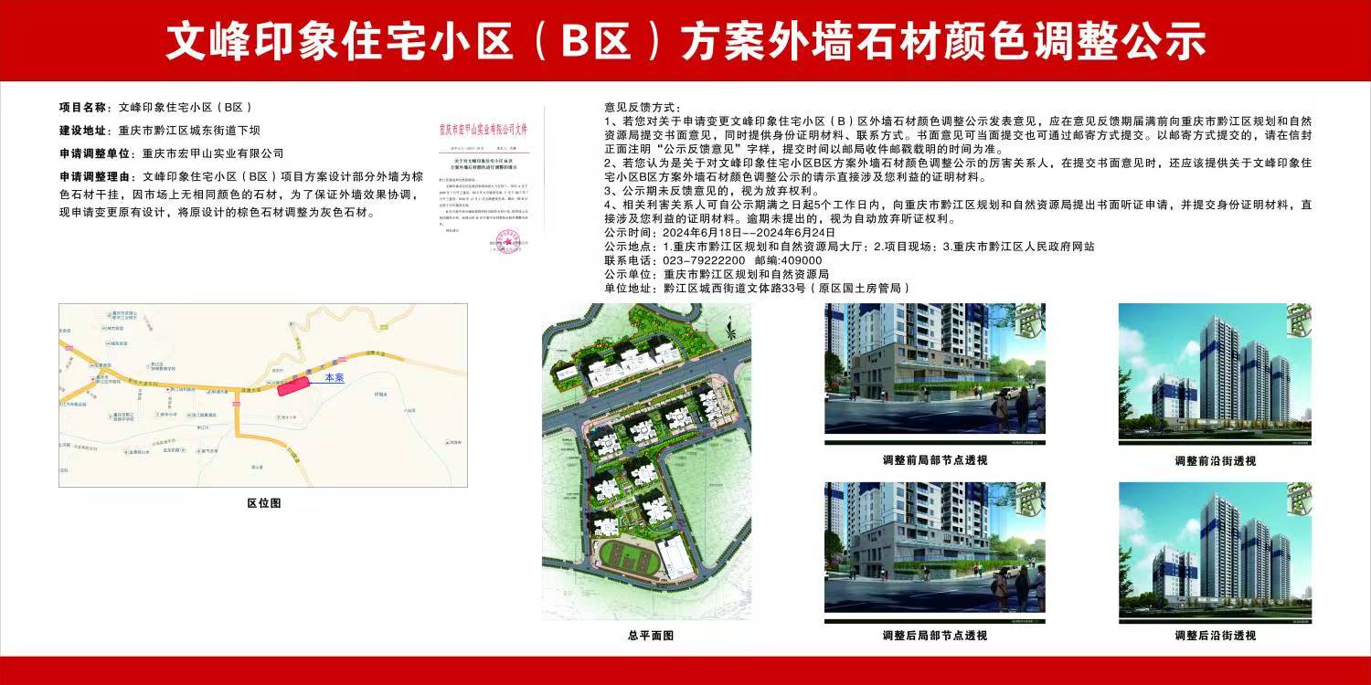 | 建设工程设计方案类公示 | 1 | 文峰印象B区项目方案外墙石材颜色调整 | 重庆市宏甲山实业有限公司 | 2024年6月18日到2024年6月24日 | 项目现场、重庆市黔江区规划和自然资源局大厅、重庆市黔江区人民政府网站 | 79240580 |