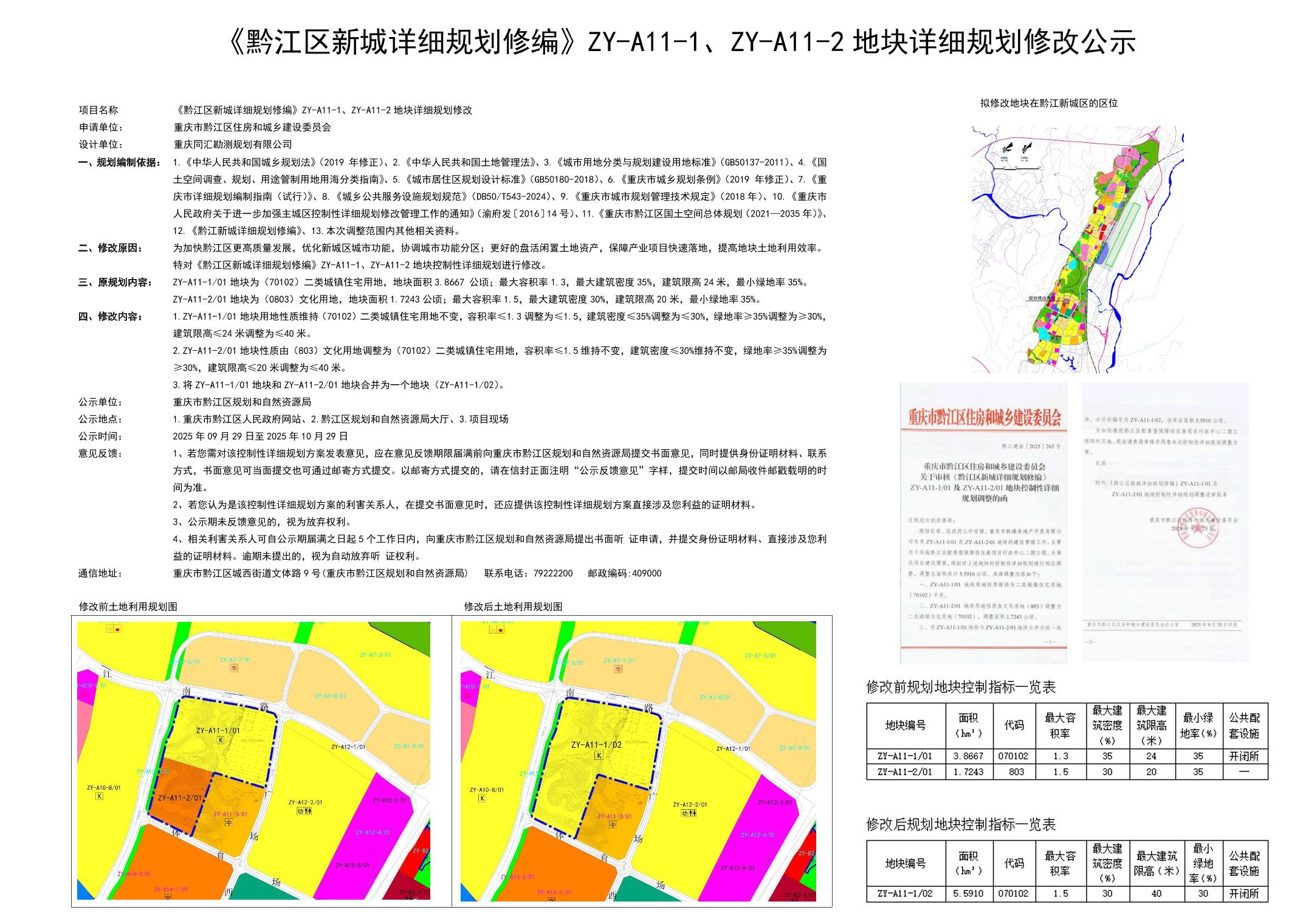 《黔江区新城详细规划修编》ZY-A11-1、ZY-A11-2 地块详细规划修改公示