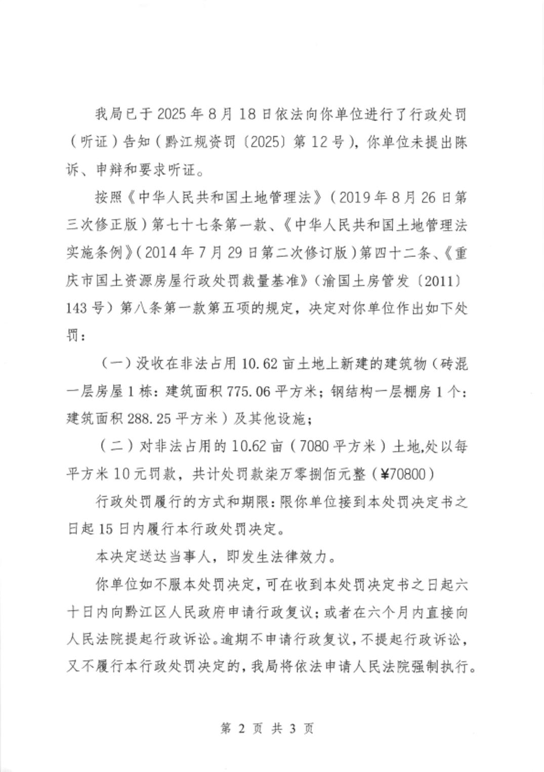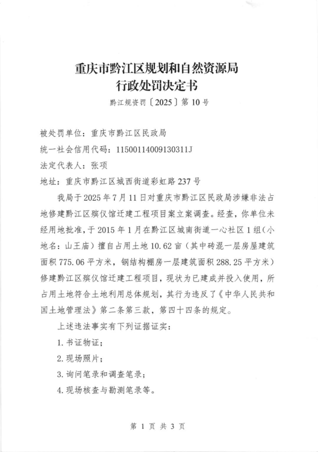重庆市黔江区规划和自然资源局行政处罚决定书(黔江规资罚〔2025〕第10号)