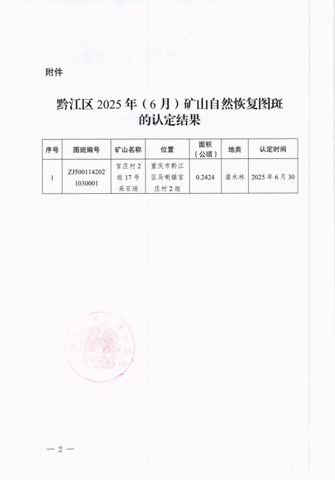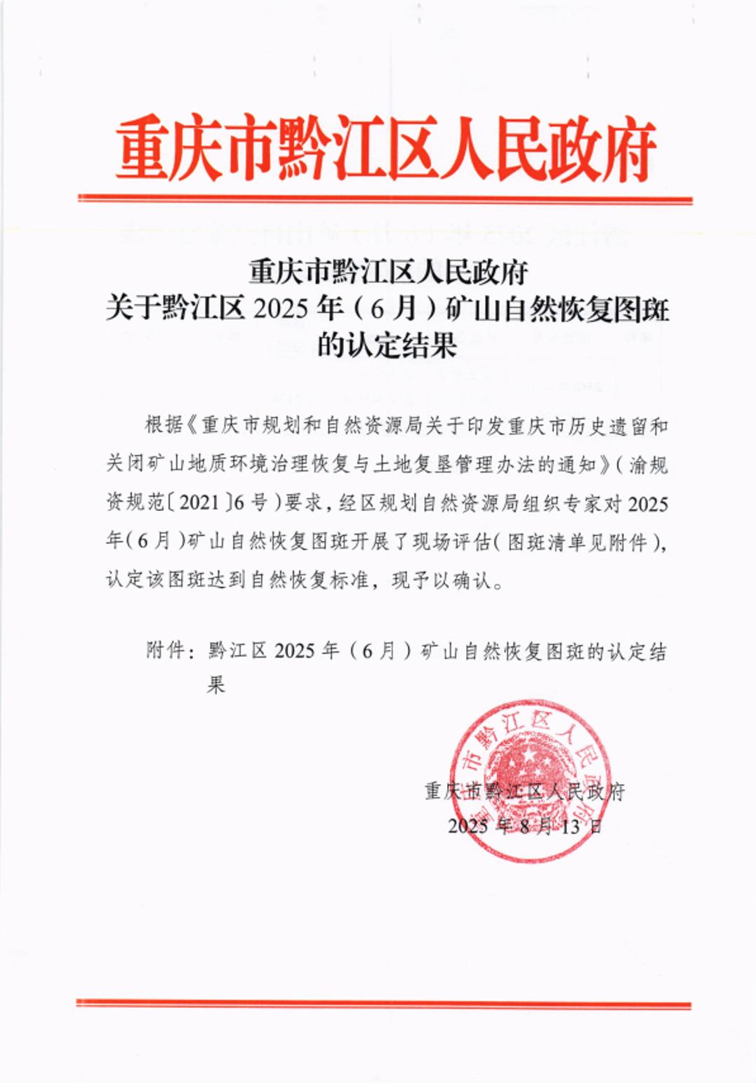 关于黔江区2025年(6)月矿山自然恢复国斑的认定结果