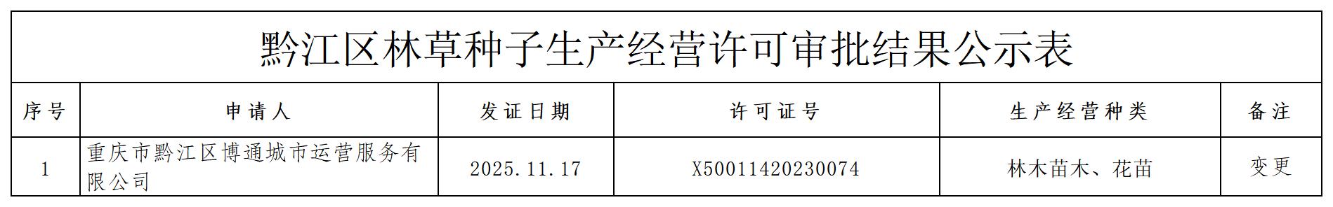 黔江区林草种子生产经营许可审批结果公示表(2025年11月)
