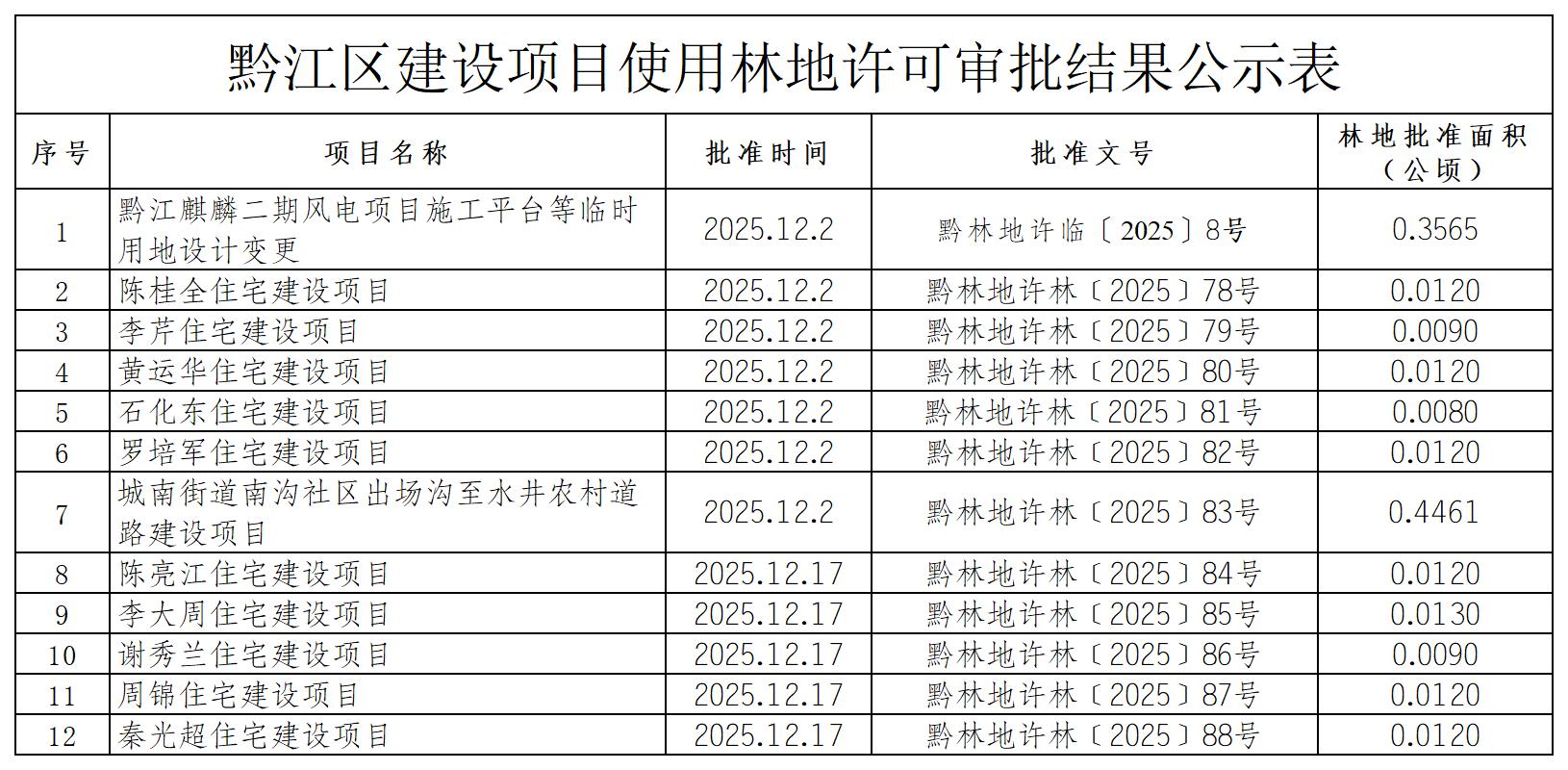 黔江区建设项目使用林地许可审批结果公示表(2025年12月)