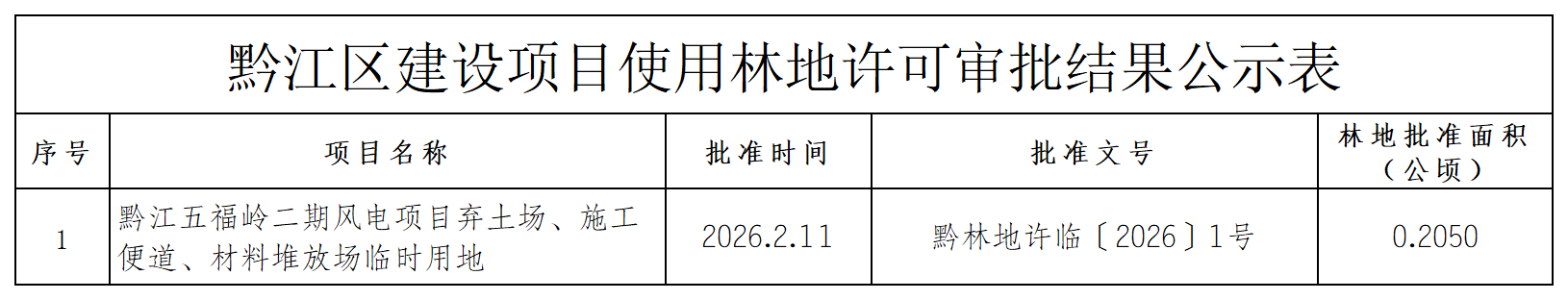 黔江区建设项目使用林地许可审批结果公示表(2026年2月)