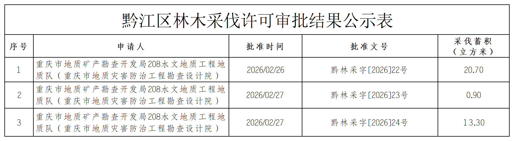 黔江区林木采伐许可审批结果公示表(2026年3月)