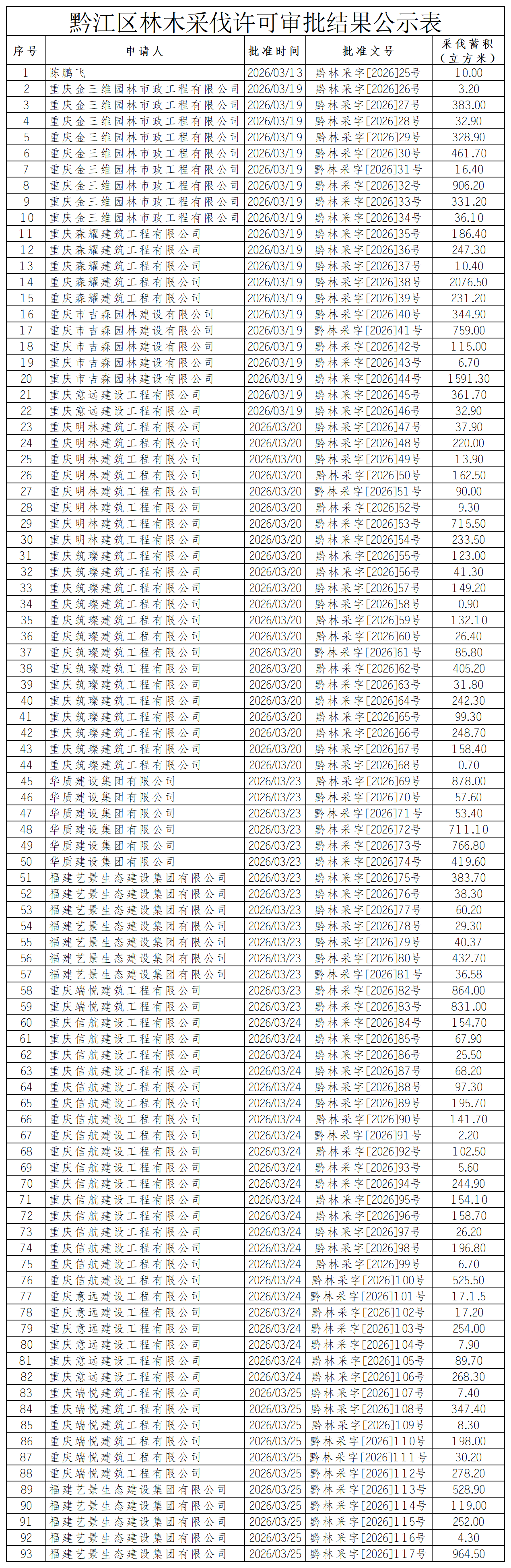 黔江区林木采伐许可审批结果公示表(2026年3月第二批)
