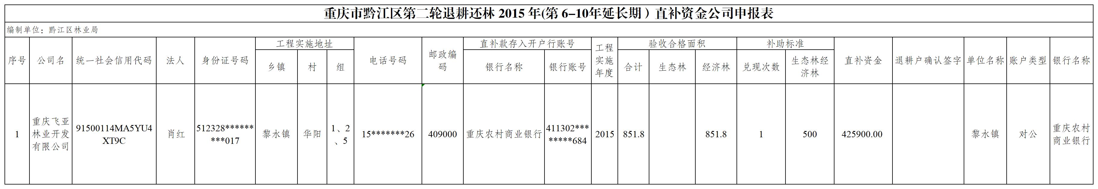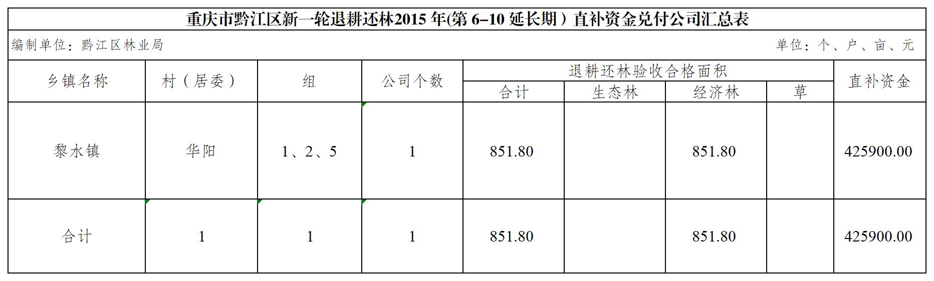 重庆市黔江区新一轮退耕还林2015 年(第 6-10 延长期)直补资金兑付公司汇总表(黎水镇).xls