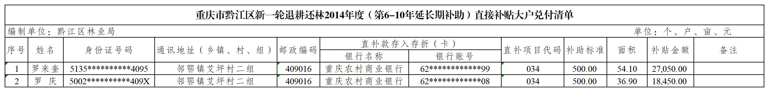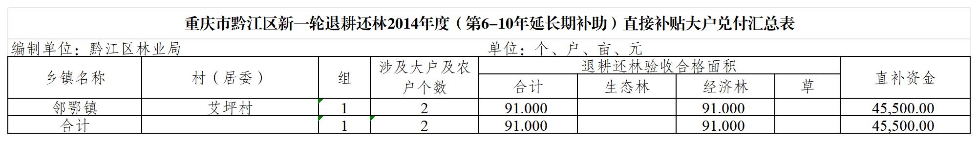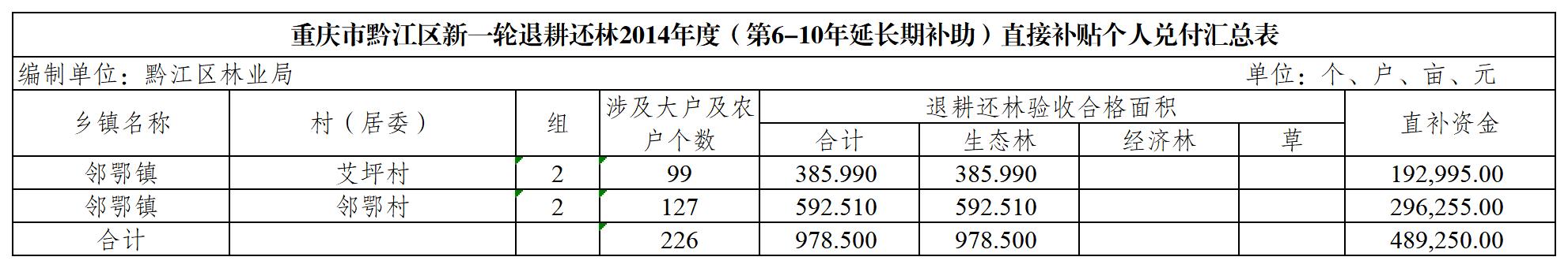 重庆市黔江区新一轮退耕还林2014年度(第6-10年延长期补助)直接补贴个人兑付汇总表.pdf