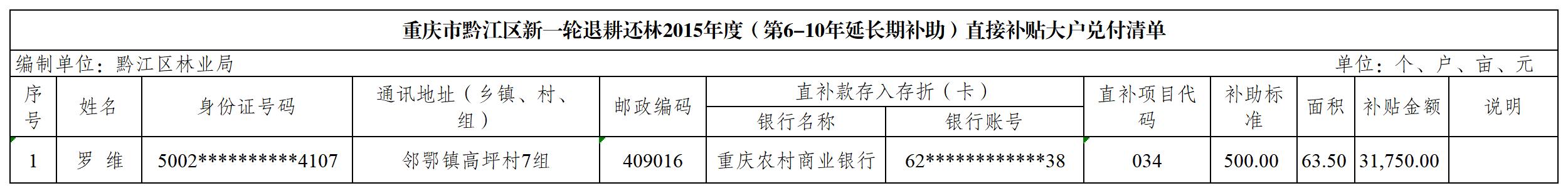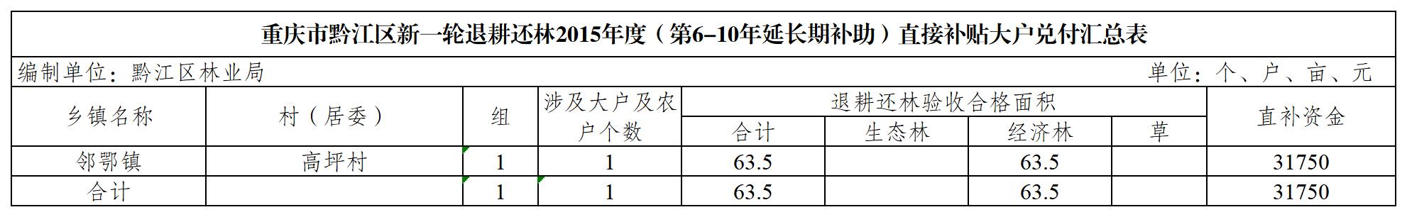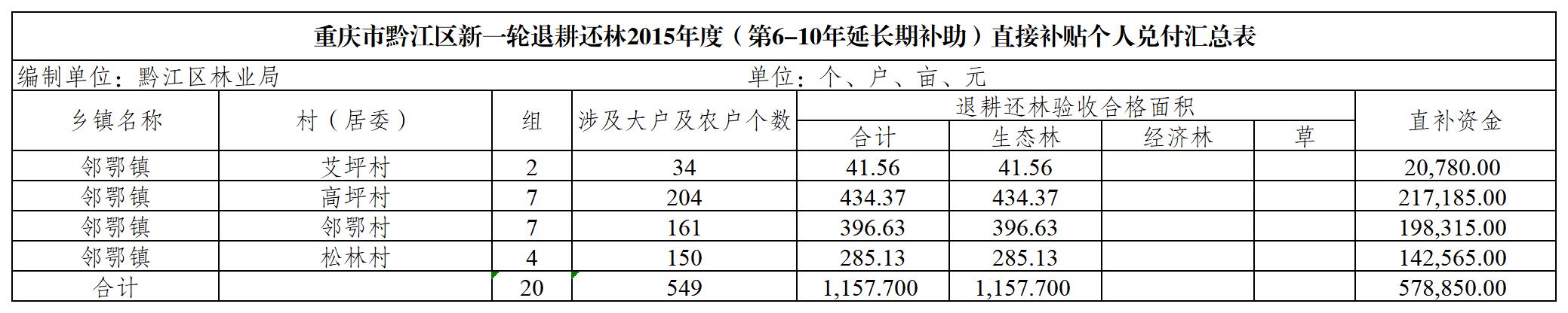 重庆市黔江区新一轮退耕还林2015年度(第6-10年延长期补助)直接补贴个人兑付汇总表.pdf