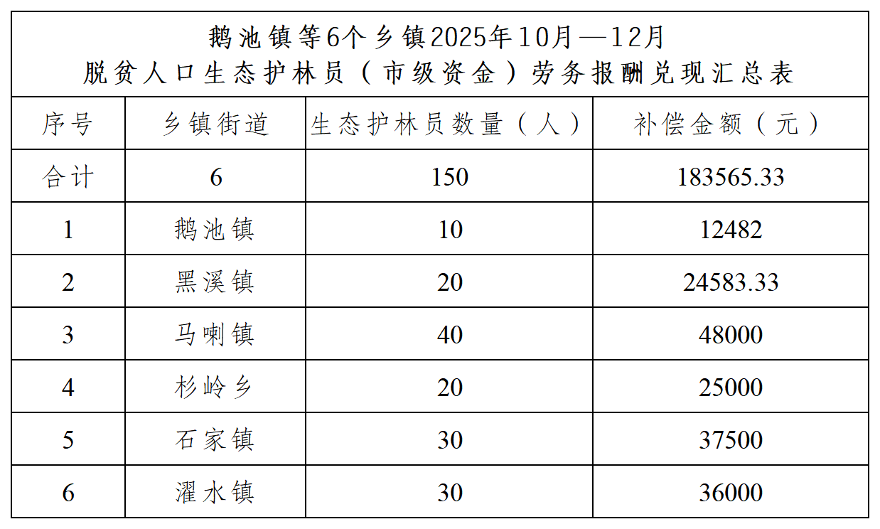 根据市级林业草原改革发展和林业草原生态保护恢复资金使当地有劳动能力的部分全国防返贫监测信息系统中已脱贫人口和监测户转为脱贫人口生态护林员,加强全区森林资源保护,帮助脱贫人口或监测户增收致富、巩固脱贫成果。现有鹅池镇、黑溪镇、马喇镇、石家镇、濯水镇和杉岭乡等6个乡镇根据考核情况申报兑现2025年10月—12月150人脱贫人口生态护林员(市级资金)劳务报酬183565.33元。